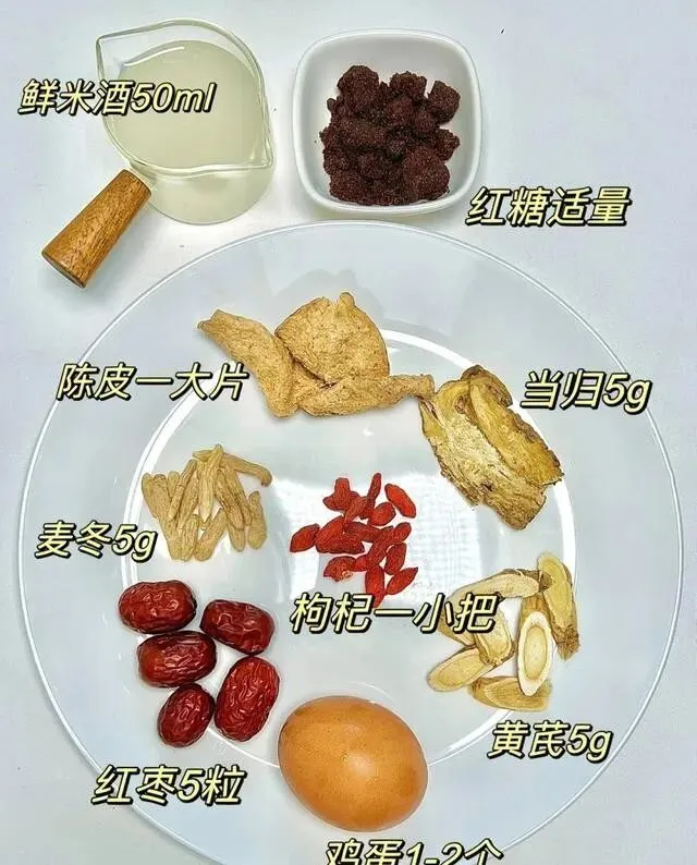 鲜米酒50ML , 新会陈皮一片 , 当归5克 , 黄芪5克。
