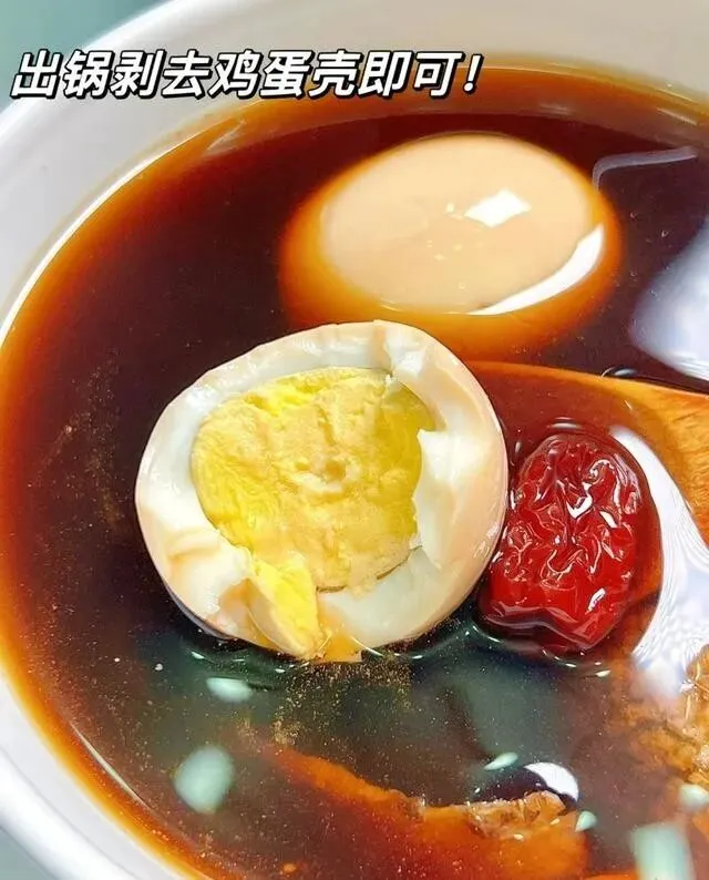 鸡蛋先煮熟捞出来 , 用勺子敲出网状裂纹 , 再丢回锅里。