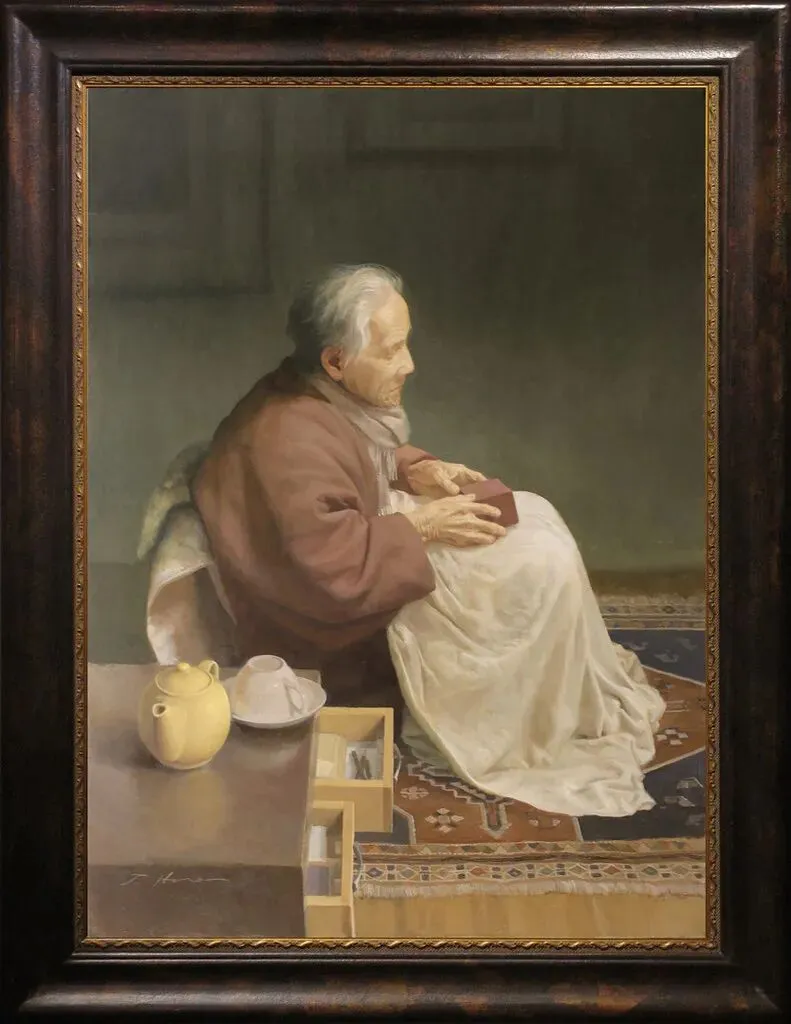 他通过细腻的层叠技法,在方寸之间表现出物体被光阴侵蚀后的质感,无论是墙面的剥落还是织物的纹理,都传递出一种“物随人老”的柔情。
