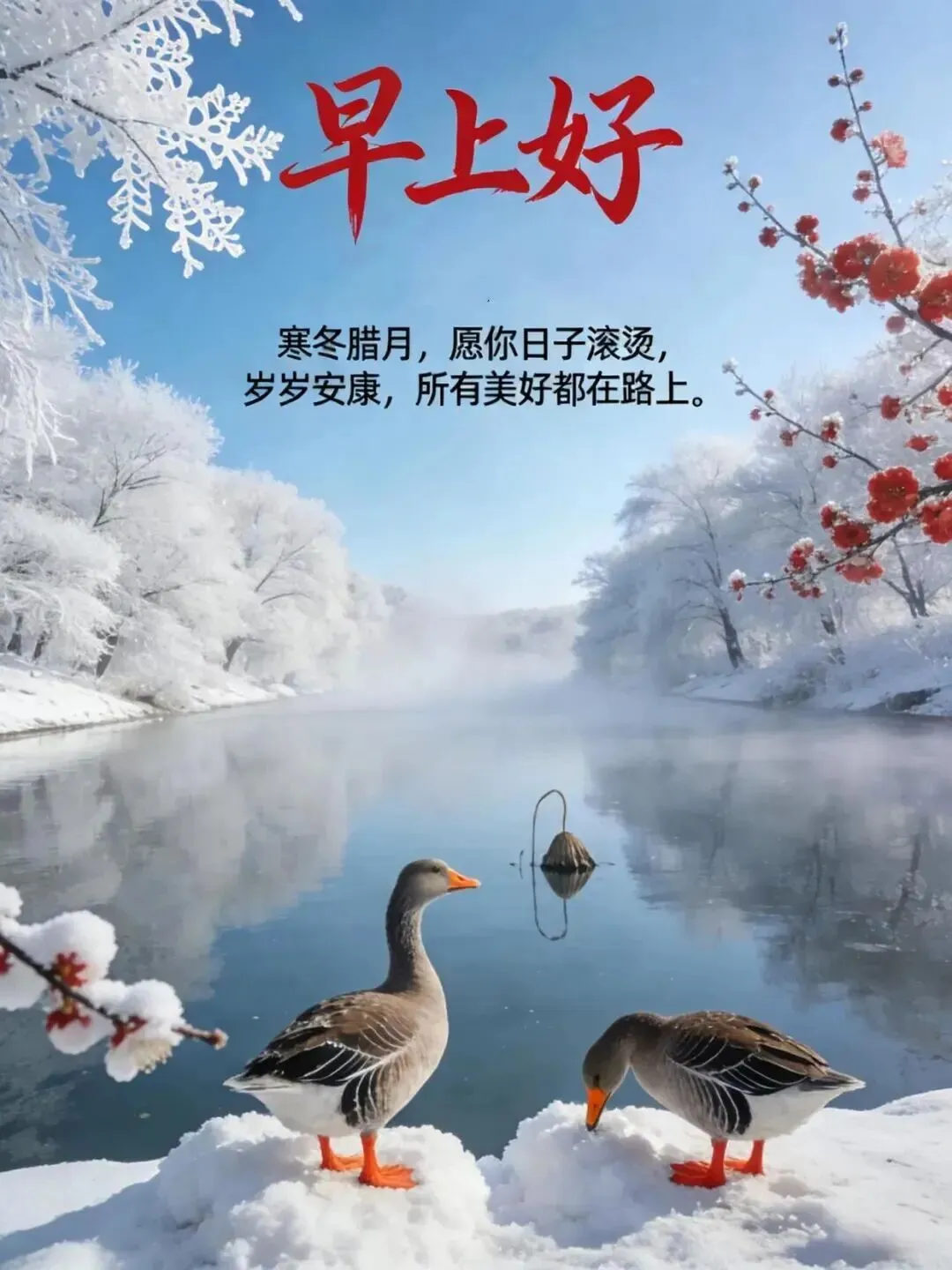 日历翻开了崭新的一页,像一张洁白的画布等待涂抹。时光是位公正的画师,它会把你的努力酿成最美的色彩。嘴角上扬,心怀希望,绘出属于你的精彩,早安!寒风吹着口哨掠过屋檐,它在告诉万物该沉睡了,却唯独吹不醒你的斗志。梅花是冬天的火种,点燃了白雪,也点燃了希望。握紧手,昂起头,奔赴热爱的战场,早安!