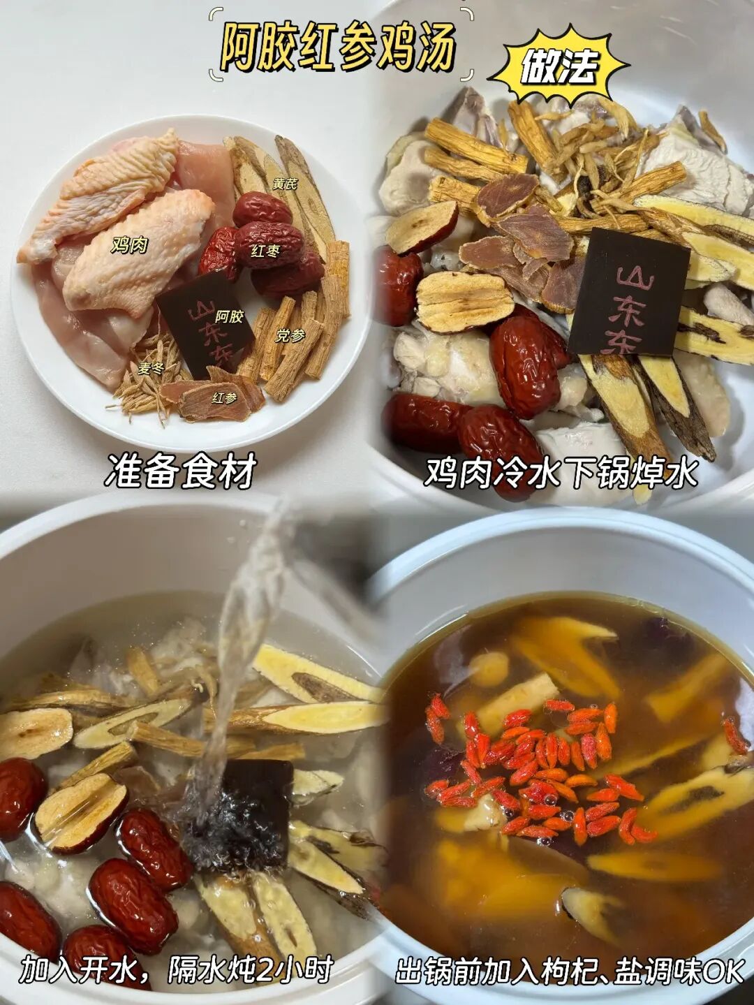 红参阿胶鸡汤的主要材料包括鸡肉、阿胶、红参、黄芪、党参、红枣、麦冬、枸杞、生姜等。