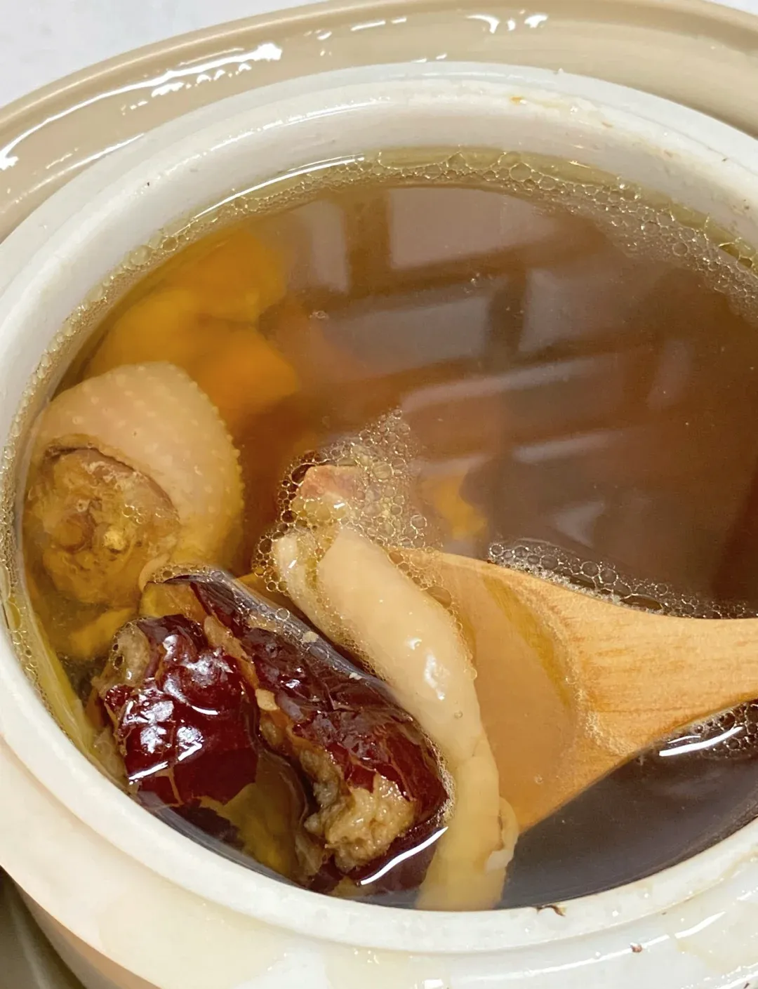 (三),炖至鸡肉酥烂,汤汁浓郁时,加入红枣、麦冬、枸杞继续炖煮片刻。