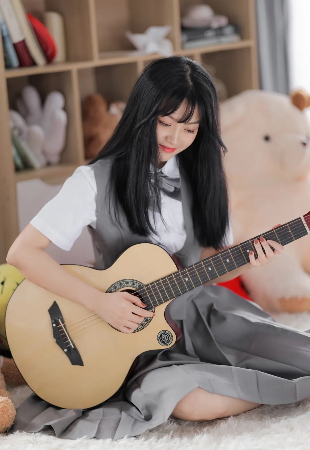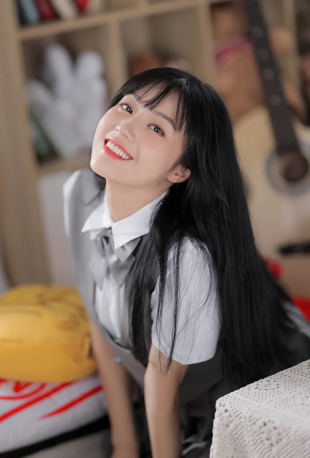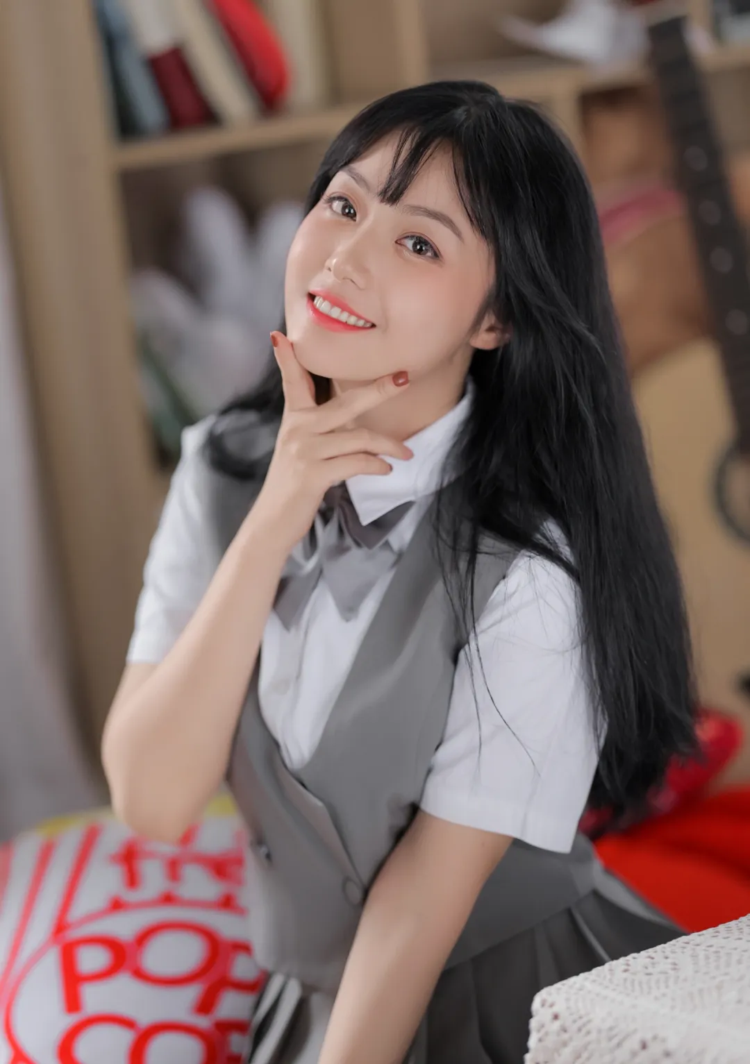 [今天穿了最爱的那套 JK 制服 —— 白衬衫的领口挺括,灰色背心刚好收住腰线,领结系得一丝不苟。]