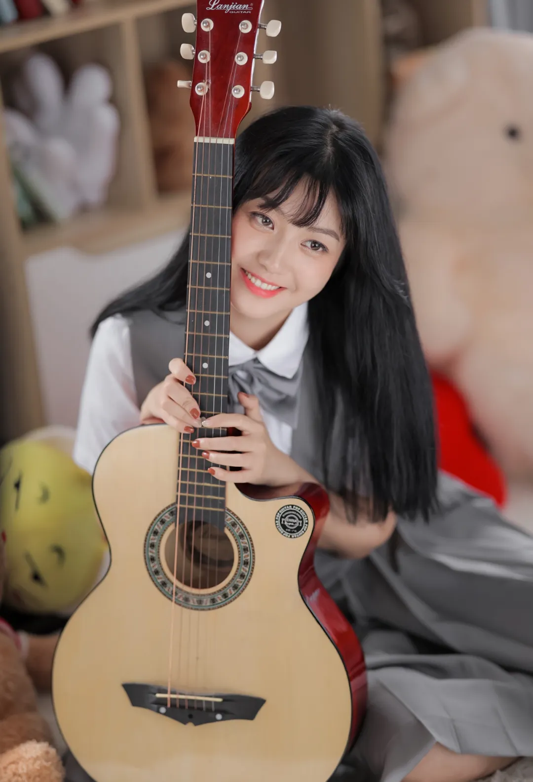 [身后的书架上,漫画和课本歪歪扭扭地挤在一起,吉他斜靠着墙,弦上还沾着昨天练琴留下的松香。]