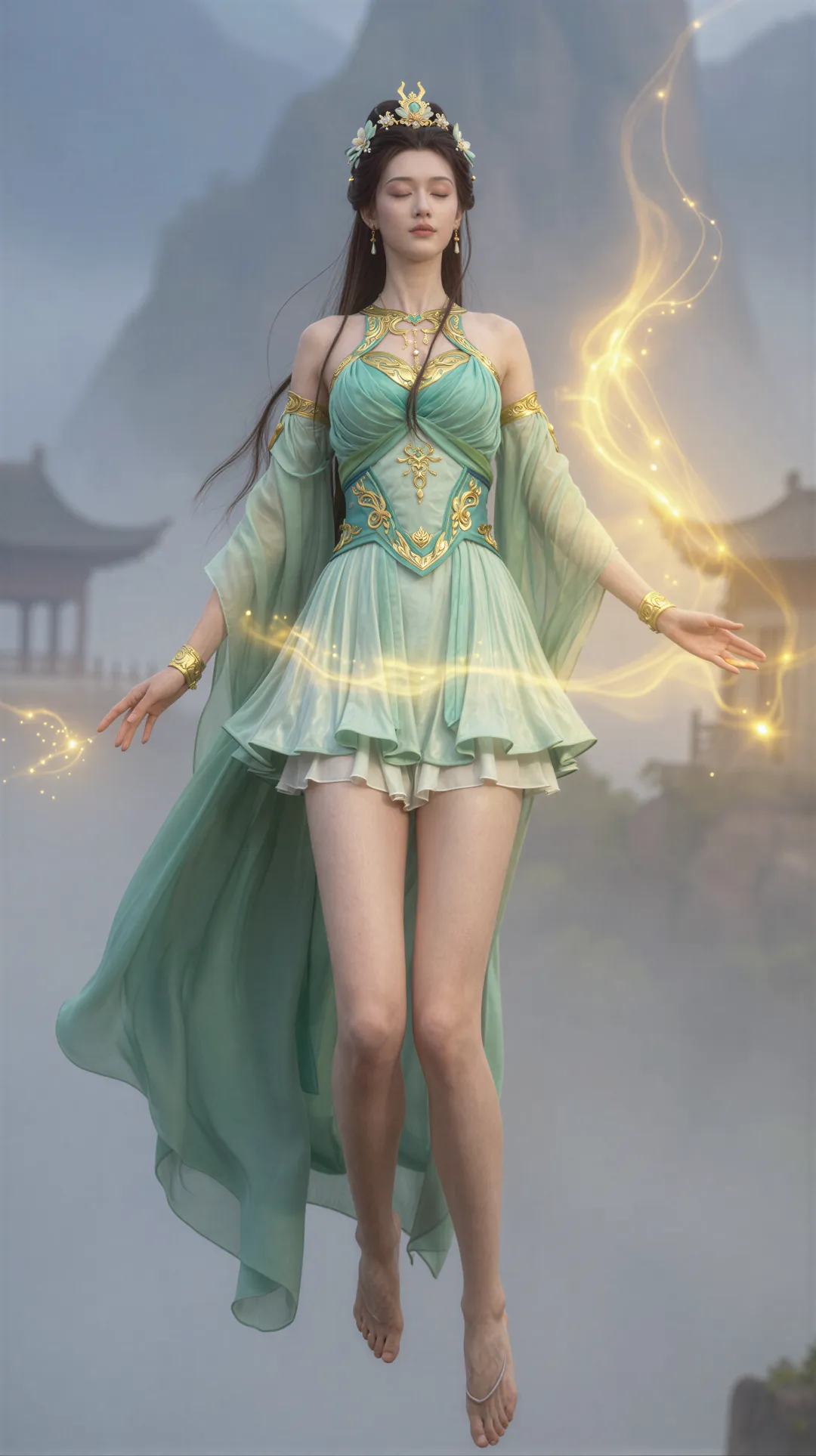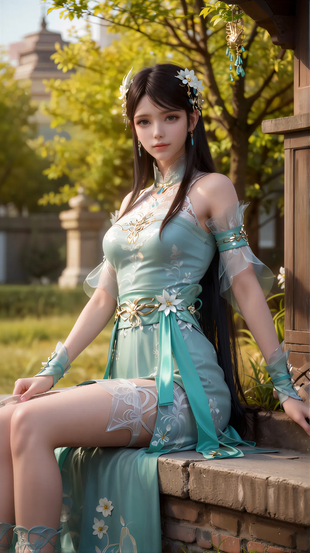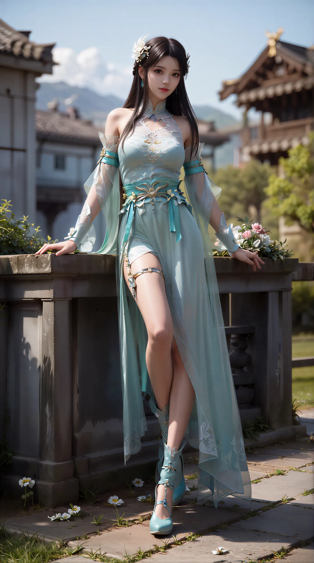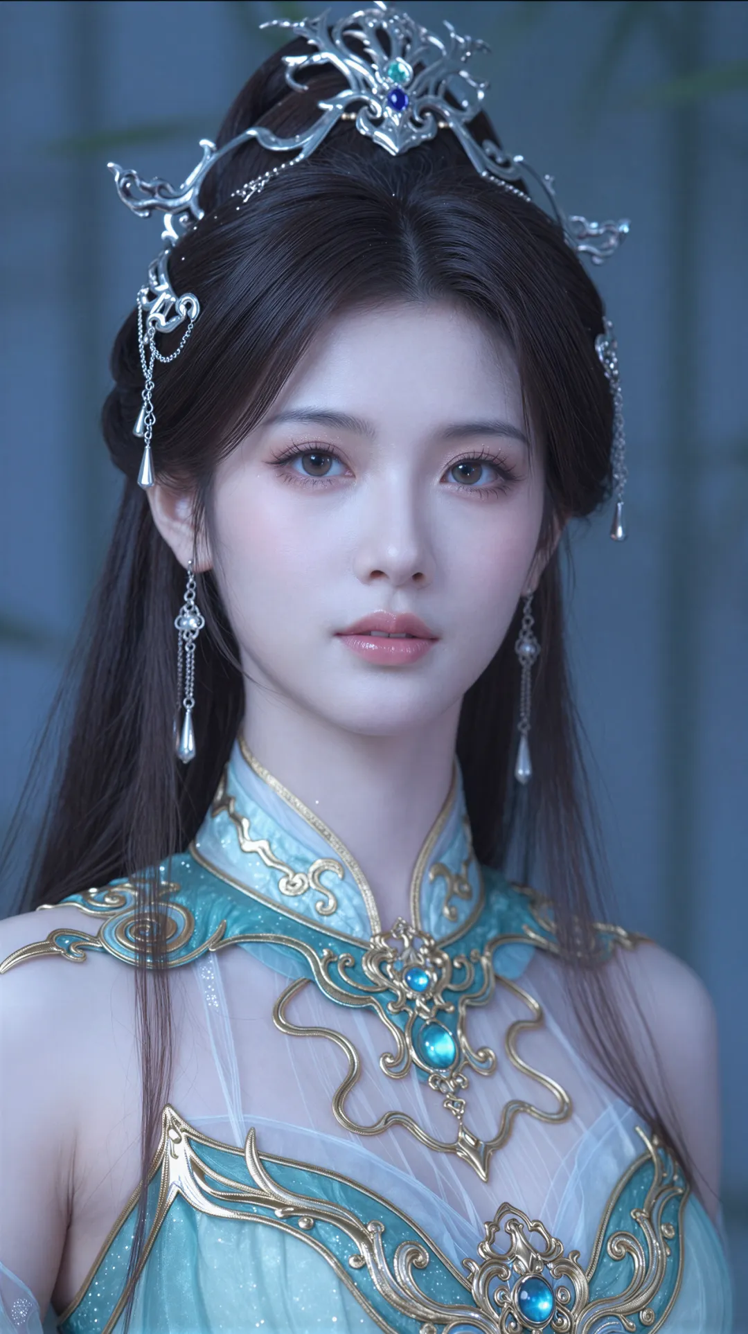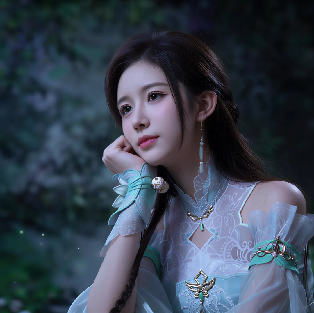 这是萧薰儿初次登场的经典造型。身穿青色长裙,手持古族玉佩,在古族宫殿的映衬下,宛如九天仙子下凡。她的眼神中透着纯真和善良,让人不禁想起那句 "青衣胜雪,气质出尘"。