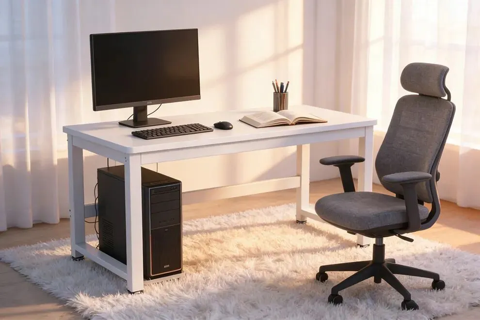 提示词3D产品图,白色电脑桌。左边显示器,右边翻开的书和笔筒,键盘鼠标。桌下有主机。灰色布艺人体工学椅摆在书的正前方。桌底铺白色长毛地毯。窗帘自然光,暖色光影。8K真实感。