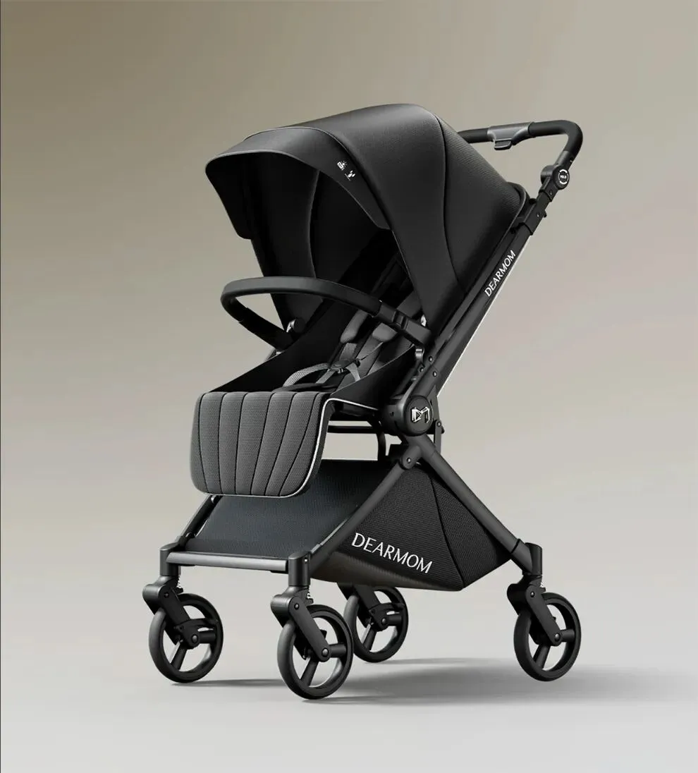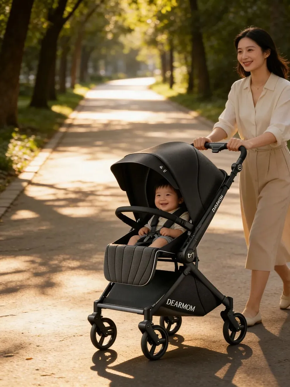 提示词年轻时尚的宝妈,推着这款婴儿车走在午后的林荫小路上,车里坐着一个微笑的萌娃。斑驳的树影,柔和的自然光。整体色彩偏暖,温馨治愈,高画质。