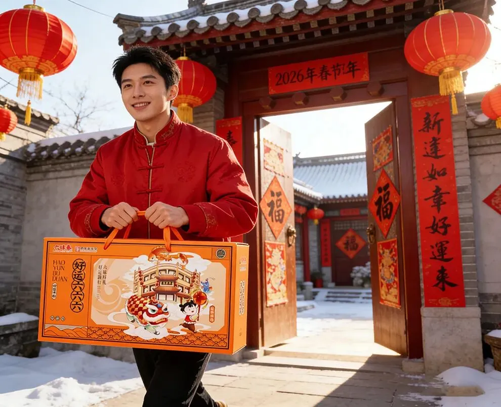 提示词一个28岁男青年穿着红色喜庆夹克,双手提着这款红色礼盒,迈步走进贴满春联的四合院大门。背景是拜年场景,挂着红灯笼,雪后初晴。特写镜头,写实质感。