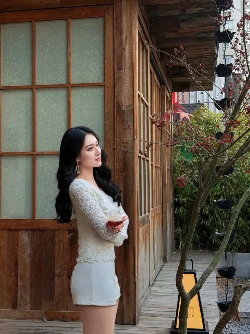 再来.看户外.的这.张,小姐.姐站.在日式木质.建筑前.,交叉抱.臂的姿态又.美又飒.。紧身.的蕾丝上.衣勾.勒出纤细的.腰肢,蕾.丝的卷.草花.纹在阳.光下闪闪发.光。下身的.白色短.裤和上衣呼.应,简.洁利落的.版型刚好露.出修.长的腿.。她.的耳饰是.长款的银.色流.苏,随着.微风轻轻.晃动.,增添了几.分灵动.。背.景的木质建.筑和周围的.绿植完美.融合,就像.从日.剧里走出来.的女主一.样温.婉。