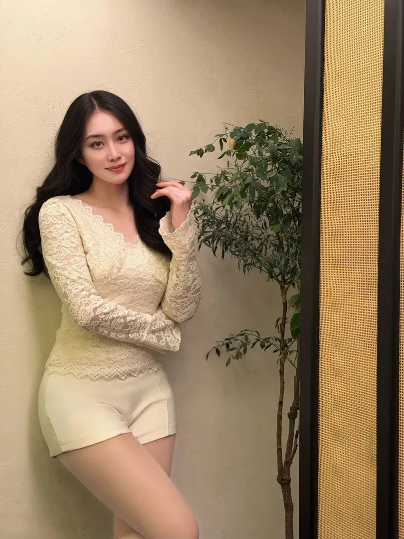 .再看这.张室内.屏风旁.的照.片,小姐姐.靠在米黄.色的墙.上,蕾丝上.衣的V.领和.蕾丝.花边完美修.饰了脖.颈线.条,同色系.的短.裤简.洁又.大方.。她的手臂.自然.地搭在肩.膀附近.,眼神温柔.地注.视着镜头.,耳饰是.长款的金.色串.珠,增.添了.几分精.致感。背.景的屏.风和绿植.营造出温.馨的氛.围,暖光打.在她脸上.,整个.人就像.油画里.走出.来的少女.一样.优雅。
