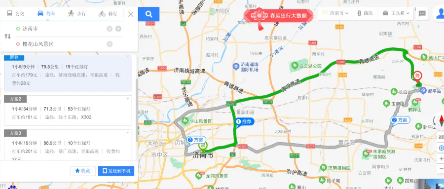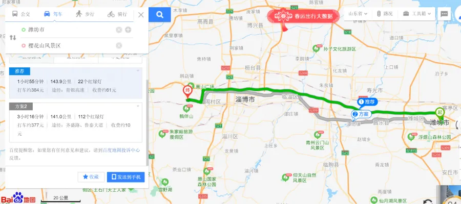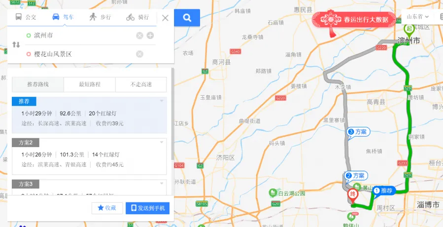 滨莱高速—麻营立交—青银高速—邹平北收费站—邹周路—鹤伴二路—醴泉五路—S246(旧)—X035—樱花山景区南门。