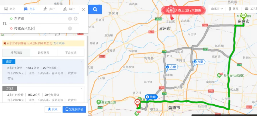 东营市区—荣乌高速—长深高速—于家庄枢纽—青银高速——邹平北收费站—邹周路—鹤伴二路—醴泉五路—S246(旧)—X035—樱花山景区南门。