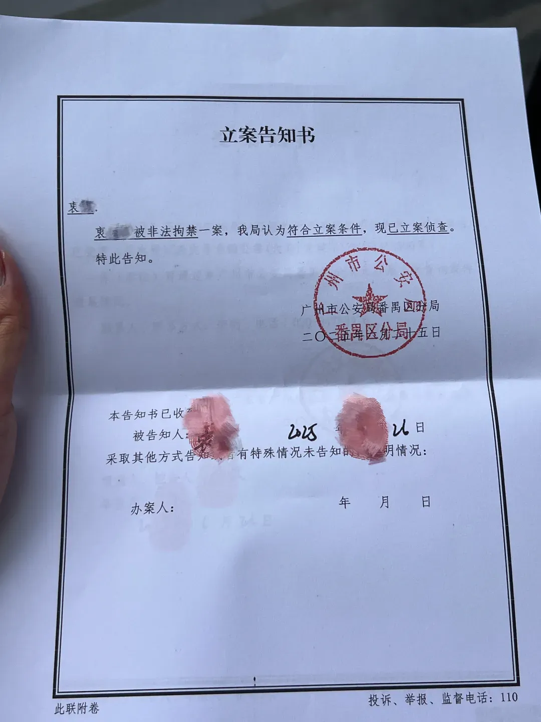 6月26日,衷女士收到了广州市公安局番禺区分局的立案告知书,警方以衷某某“被非法拘禁”,对此立案侦查。