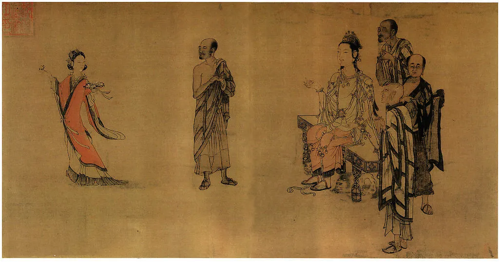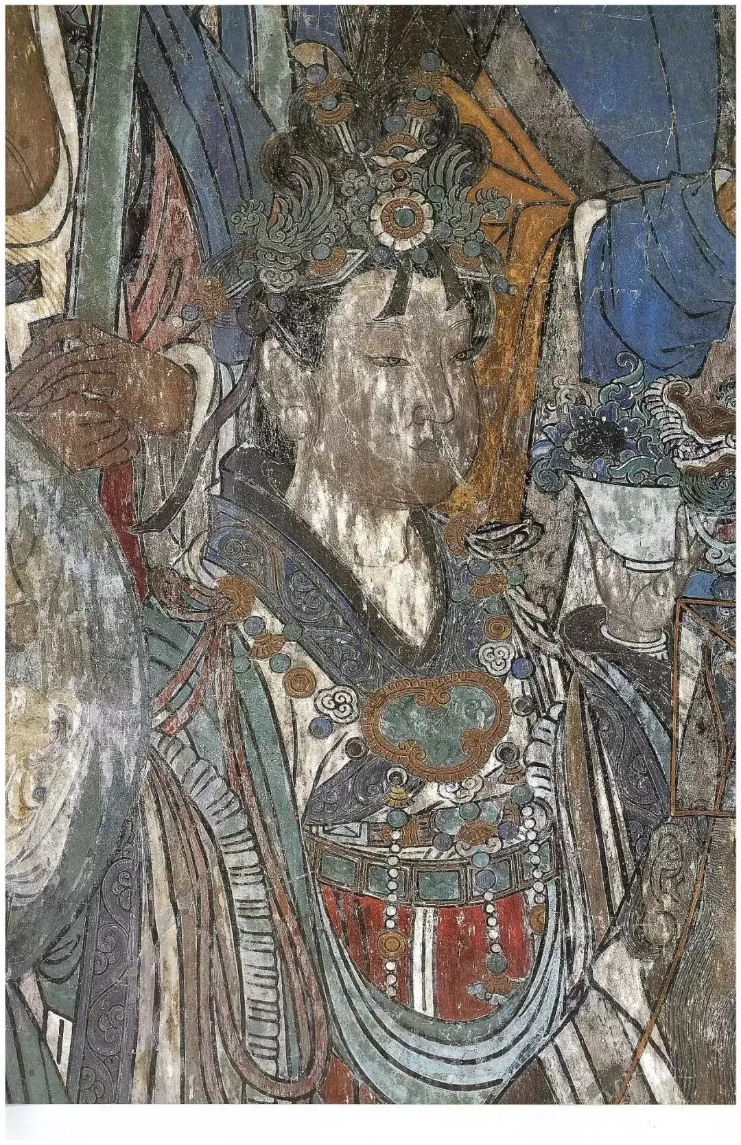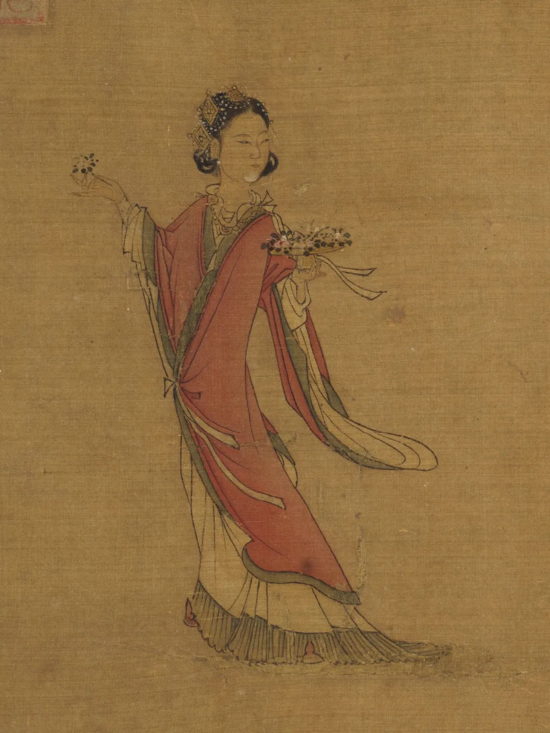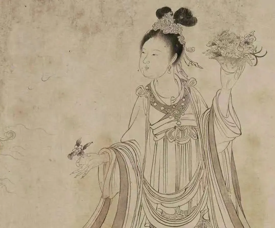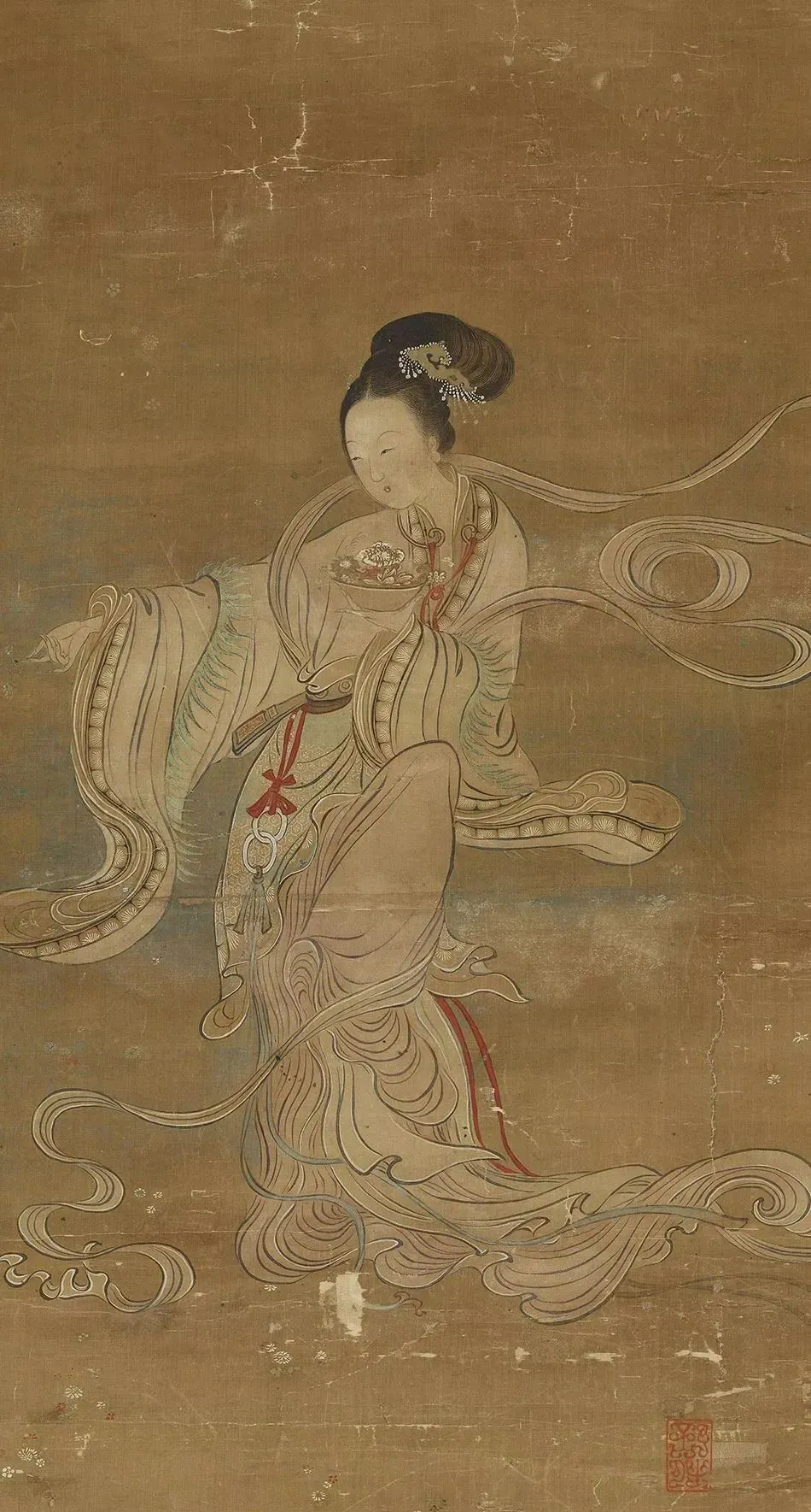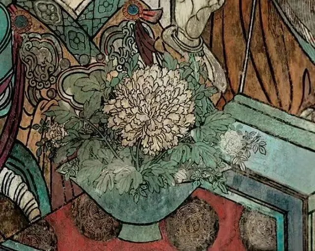 碗花者托于天女手中,其一手托满碗花材,另手执一花朵做献花状,或散花状,神情肃穆庄严,神姿轻盈,自带仙逸之气。碗里的花材很是丰富,以牡丹、莲花为多见。天女手上托的碗有白色有黑色,定窑白瓷如白莲般清净圣洁,黑釉瓷则沉实庄重,于此宗教场所用供花最是相宜。