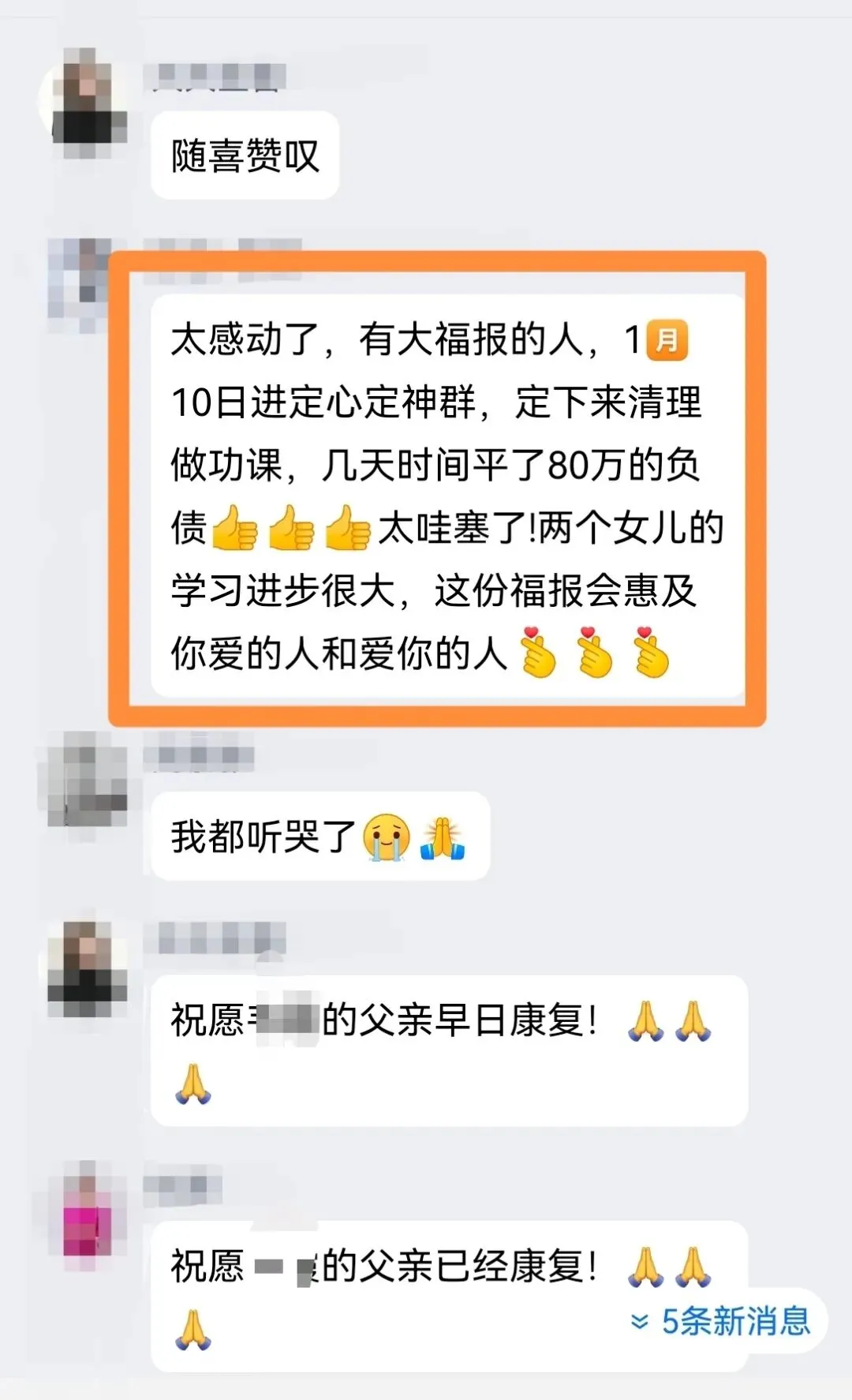 直到她1月10日跟着我们定心定神零极限清理后。这16天的时间,每天静下心来清理自己的负面情绪和思维。随着一天天坚持下来,奇迹真的出现了。原本看似无解的债务问题,开始有了转机。朋友也主动找来合作百万项目,一些欠款也顺利收回。
