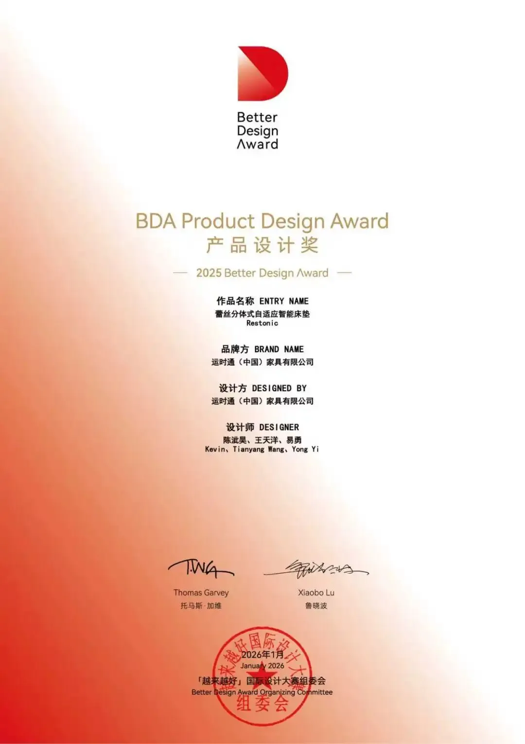 此次荣获 2025“越来越好”国际设计大赛产品设计奖,既是对蕾丝床垫技术与设计实力的权威肯定,也是对其在智能睡眠领域前瞻布局的高度认可。未来,蕾丝床垫将持续以设计为驱动,深耕健康睡眠赛道,不断打磨更具价值、更具温度的智能睡眠产品与系统解决方案,让真正的好设计,服务更长久、更真实的睡眠生活。