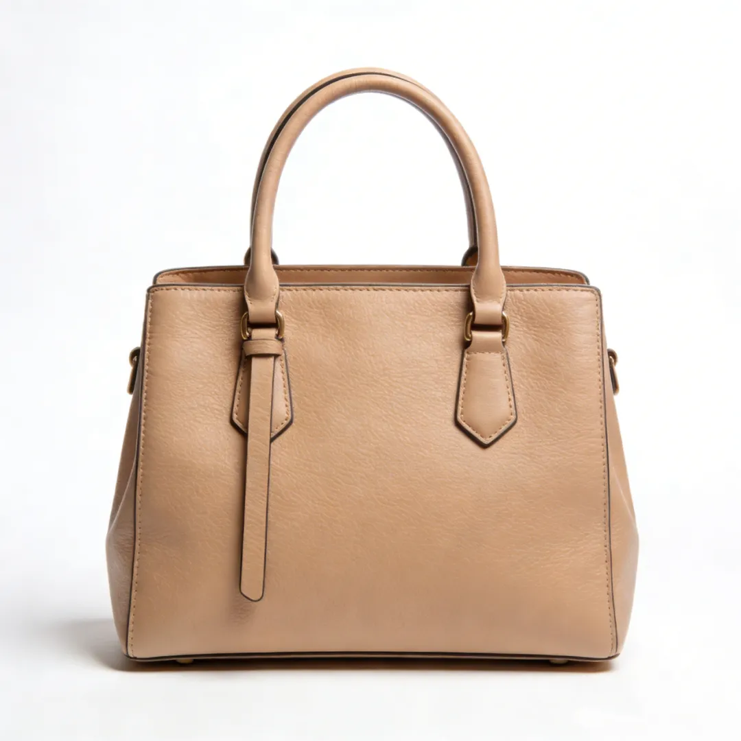 浅卡其色的荔枝纹皮革手提包,包身呈挺括的方形轮廓,搭配复古金色五金件与同皮料短柄。