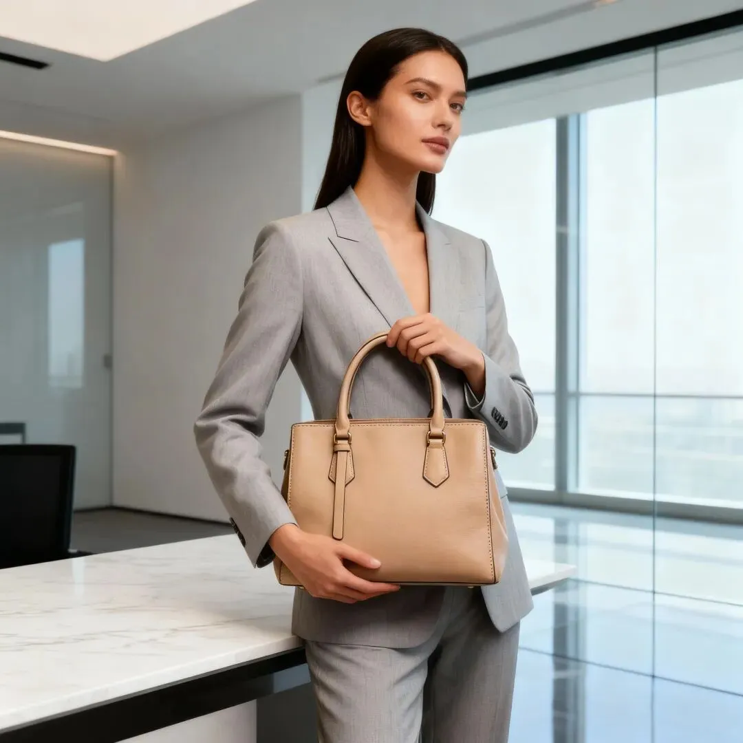 画面里的模特自带女王的气场,浅灰色西装和裸色包包的配色高级又和谐,写字楼的落地窗背景瞬间拉满了都市精英感。无论是上班通勤还是商务会议,这张模特图都能完美展现包包的职场适配度,直接可以当品牌大片用!
