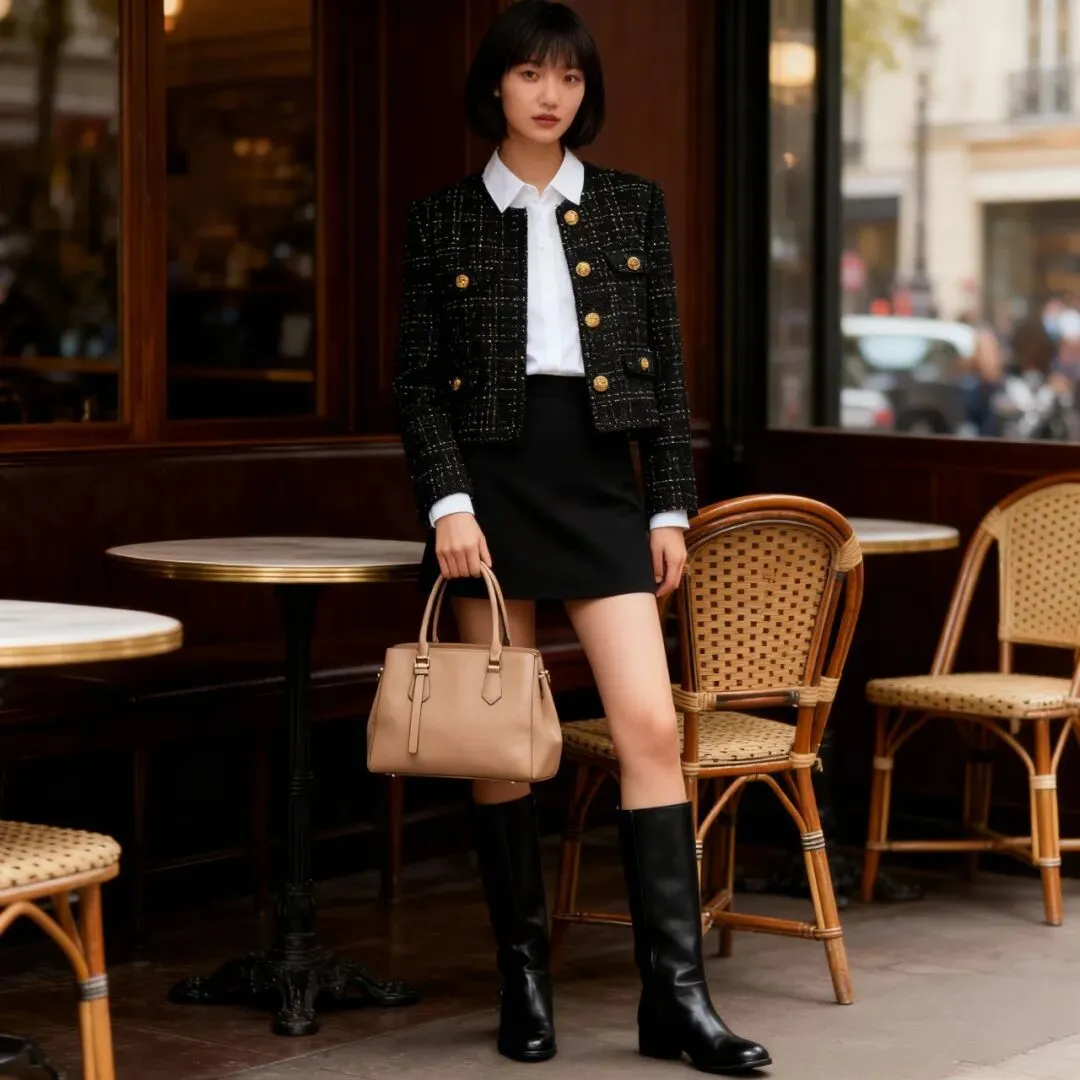 写实风格,一位气质清冷的东亚短发年轻女性,身穿经典黑金扣粗花呢短外套、白色衬衫、黑色迷你裙和黑色长靴。她站在法式街头咖啡馆的复古藤椅旁,手上提着这款包,保持包包样式完全不变。背景是深色木质桌椅、藤编椅子和模糊的街景。