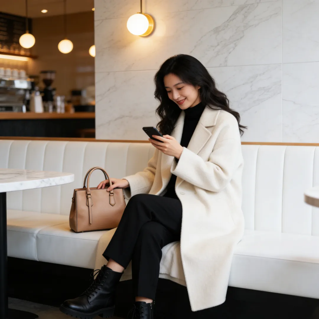 写实风格,一位温柔优雅的东亚长发微卷年轻女性,身穿米白色长款羊毛大衣、黑色高领内搭、黑色西装裤和黑色马丁靴。她惬意地坐在现代简约咖啡馆的白色皮质卡座上,背景是大理石墙面和暖光氛围灯。她低头看着手机微笑,手轻扶着这款包。背景有大理石桌面和模糊的咖啡吧台。