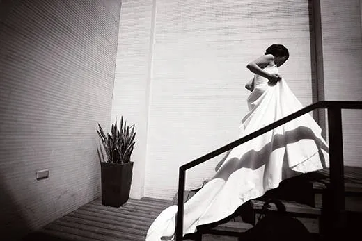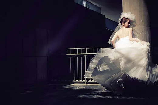 如果觉得引导动作或设计情境是件很困难的事,那么,就请模特做平常的动作就可以了。上下楼梯很简单吧?跑过去跑过来很简单吧?蹲下起立总不难吧?每当我拍摄婚纱时,总是请新娘做最简单的动作,而剩下的,就交给摄影师了。