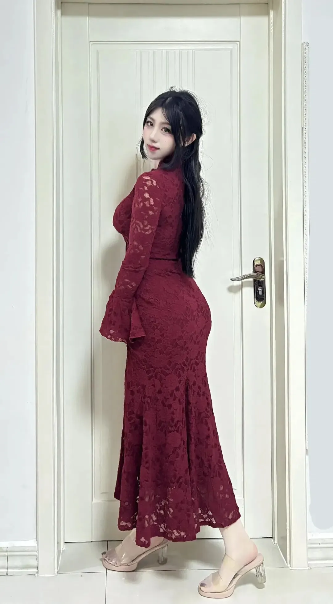 当前位置:首页>美女资讯>酒红蕾丝鱼尾裙 + 透明高跟凉鞋,妩媚又精致,穿着贴身还显气质