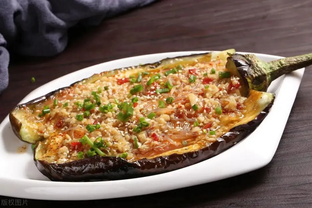 第三种是烤茄子。这道菜虽然美味,但蒜蓉的含量很多,几乎整个茄子都被蒜蓉覆盖了。