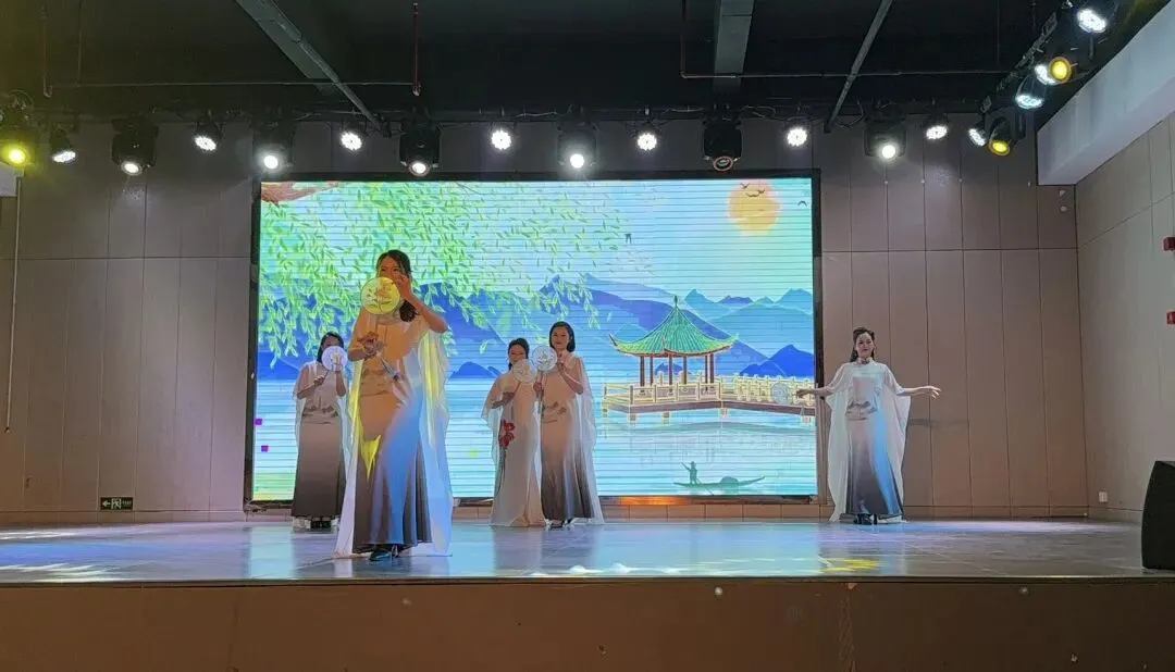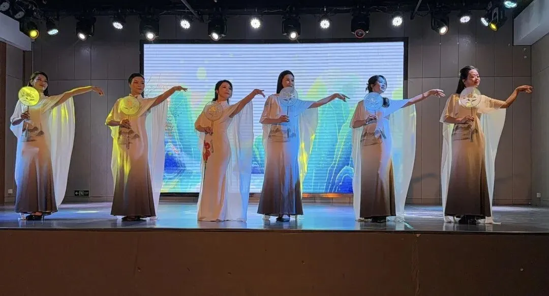帷幕轻启,一曲《青城山下…》悠然响起。十余位学员身着素雅长裙,手持绢伞,步履轻盈,舞姿翩跹,将江南水乡的婉约与青城山下的灵秀融于一体。开场舞瞬间将观众带入一个宁静而诗意的境界,也展现了学员们经过数月训练后焕发的自信与风采。