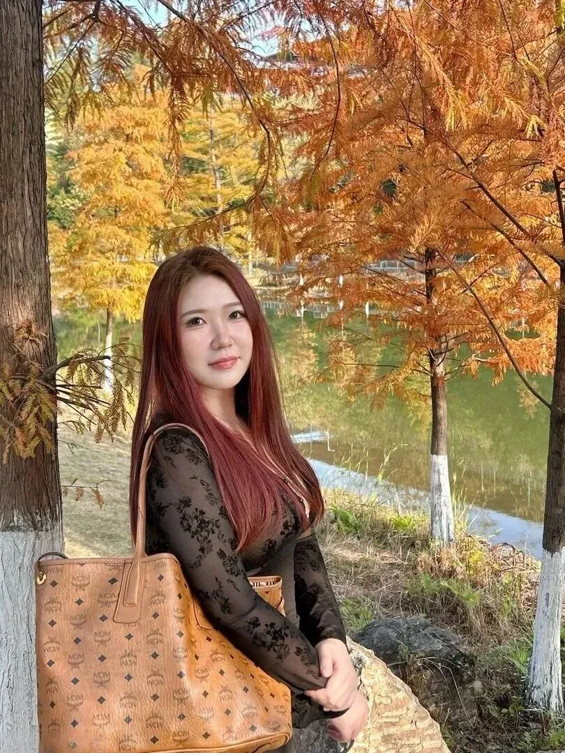 全黑的.一身最怕沉.闷。她配.了个棕色的.印花手提包.,整个人一.下子就亮起.来了。.这个包.的颜色很妙.,是.带点橘调的.焦糖色,和.周围的红叶.特别搭。.包上的印花.是复古植物.图案,.金属扣是做.旧的黄铜.色,.和裙子的.优雅.气质很.配。