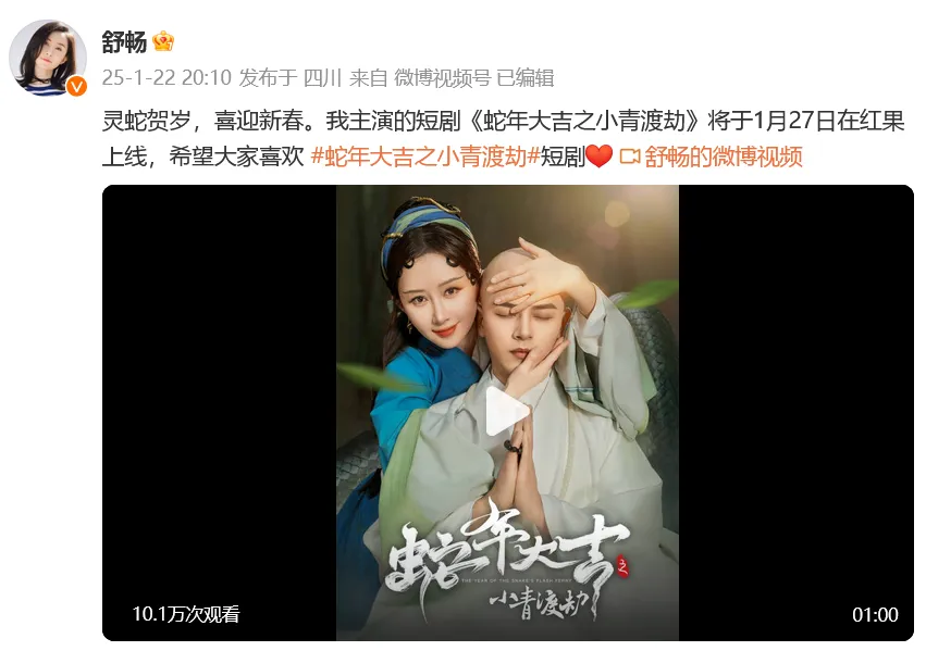 舒畅晒出宣传视频写道:“灵蛇贺岁,喜迎新春。我主演的短剧《蛇年大吉之小青渡劫》将于1月27日在红果上线,希望大家喜欢。”