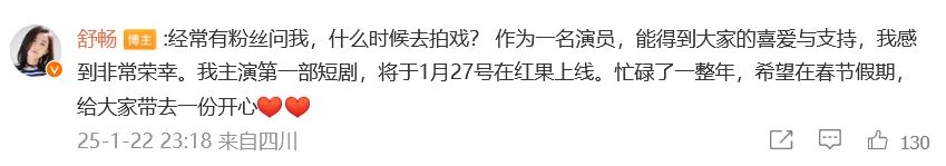 舒畅还在评论区补充回应“什么时候去拍戏”的话题:“作为一名演员,能得到大家的喜爱与支持,我感到非常荣幸。我主演第一部短剧,将于1月27日在红果上线。忙碌了一整年,希望在春节假期,给大家带去一份开心。”