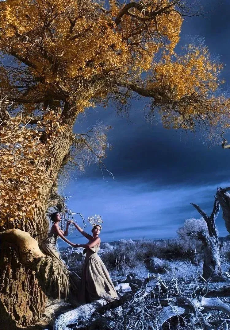胡杨……这是一个神奇的树种,它的生长总是和凤凰与鲜血紧密相连……这是一个多变的树种,春夏为绿色,深秋为黄色,冬天为红色……这是一个坚强的树种,活着一千年不死、死后一千年不倒、倒后一千年年不朽……