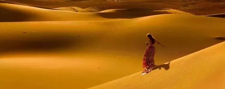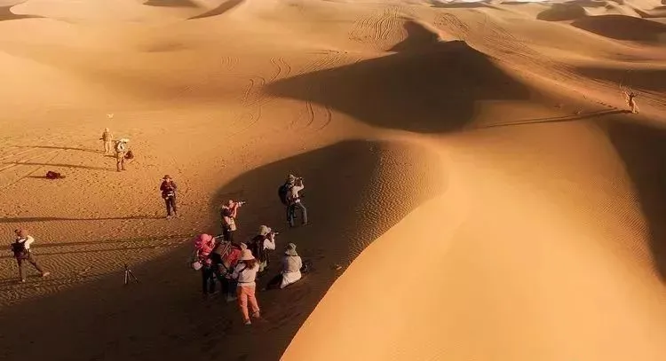 沙丘轮廓清晰、层次分明;丘脊线平滑流畅,迎风面沙坡似水,背风坡流沙如泻。站在大漠深处沙山之巅,可静观大漠日出的绚丽,目睹夕阳染沙的缤纷,赞叹“大漠孤烟直,长河落日圆”的壮景。