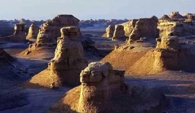 这是大自然的杰作,堪称鬼斧神工,苍凉的美丽。在远之处就是著名的楼兰古城遗址,据说大约一亿多年前,这里曾经是准葛尔的大湖泊,曾经有无数的恐龙在这里赖以生存,然而,天地变化,地壳运动,随着时空的巨变,湖水消失,湖底升起了陆地、湖底山或礁石,阳光、风雨成了雕刻雅丹的工具,让它们在岁月的抚摸、打磨中形成。