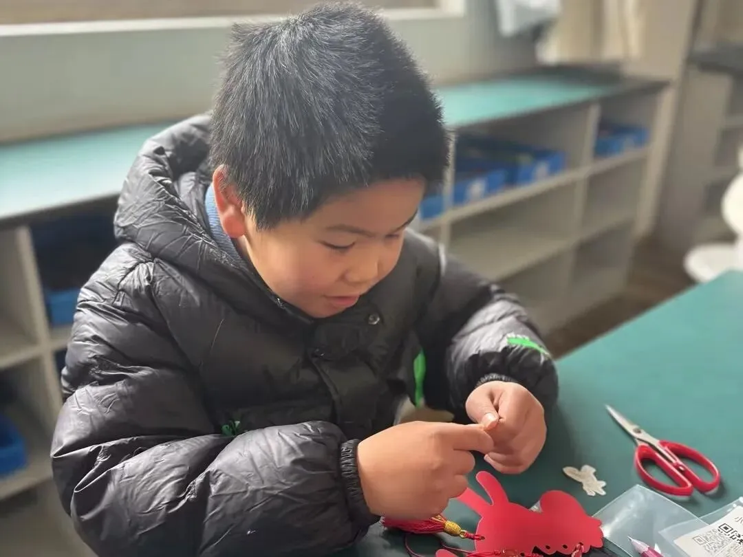 知识探索过后,课堂转入纸蕾丝手工创作环节,瞬间点燃孩子们的创作热情。吴老师先引导孩子们欣赏精美纸蕾丝作品,触摸传统工艺的细腻质感,初步感知其艺术魅力。孩子们化身小小艺术家,在吴老师的耐心指导下,细致勾勒纹样、小心翼翼压凸塑形,再用柔软羊毛线为福马制作鬃毛,每一个动作都饱含专注与用心。他们还将对新年的美好期许落笔于作品之上,把平安顺遂、快乐成长的祝福融入其中,让每一匹纸艺福马都承载着温度与童趣。