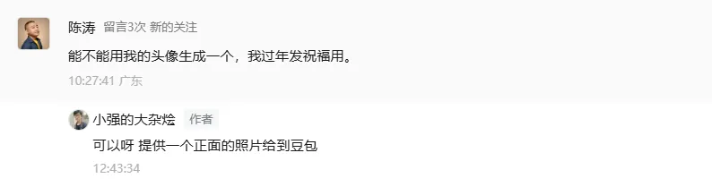 留言问能不能用他的头像生成一个,过年可以发祝福用,那当然可以,主打一个宠粉~
