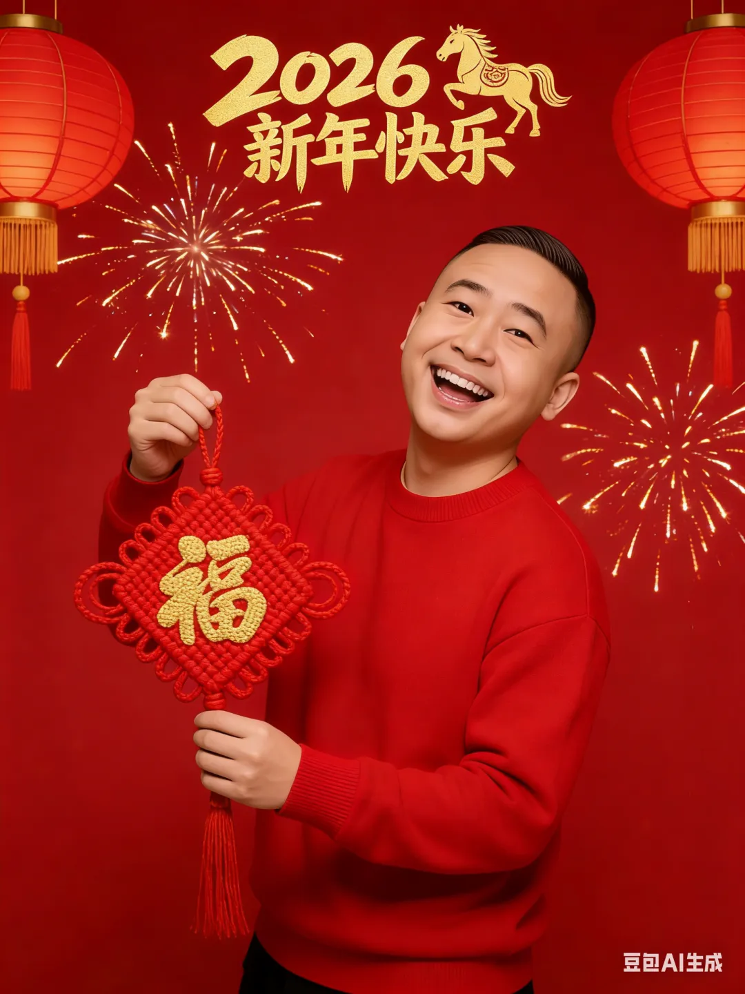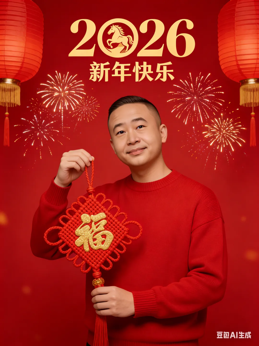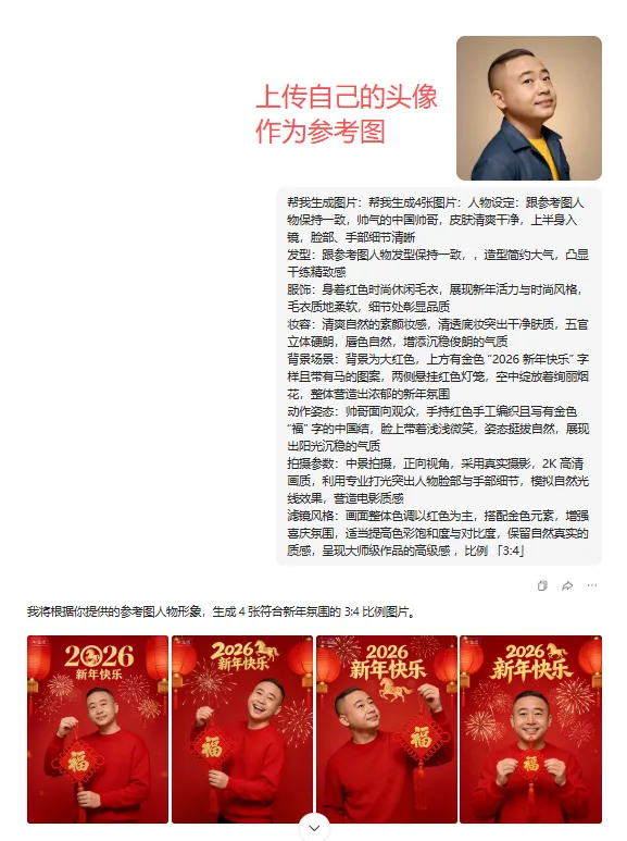 比如:跟豆包说:把下面的提示词 改成男性的:人物设定:美丽的中国美女,皮肤白皙,上半身入镜,脸部、手部细节清晰 发型:头发盘起,干净利落,展现精致气质 服饰:身着红色时尚休闲毛衣,凸显新年氛围与时尚感 妆容:打造精致妆容,五官凸显,樱桃小口,凸显自然美态,展现好气色 背景场景:背景为大红色,上方有金色的 “2026新年快乐” 字样且带有马的图案,两侧布置红色灯笼,空中点缀烟花,营造浓厚新年氛围 动作姿态:美女面向观众,双手做出比 “爱心” 的可爱动作,动作活泼灵动,表情丰富多样,每张图片都展现不同可爱神态,突出活泼可爱气质 拍摄参数:采用真实摄影,中景拍摄,正向视角,高清画质,以展现人物整体与背景环境。通过专业打光,凸显人物面部与手部细节,营造电影质感 滤镜风格:整体画面增强喜庆氛围,色调以红色为主,金色点缀,提升色彩饱和度,增强画面明亮度,打造大师级作品质感,比例3:4