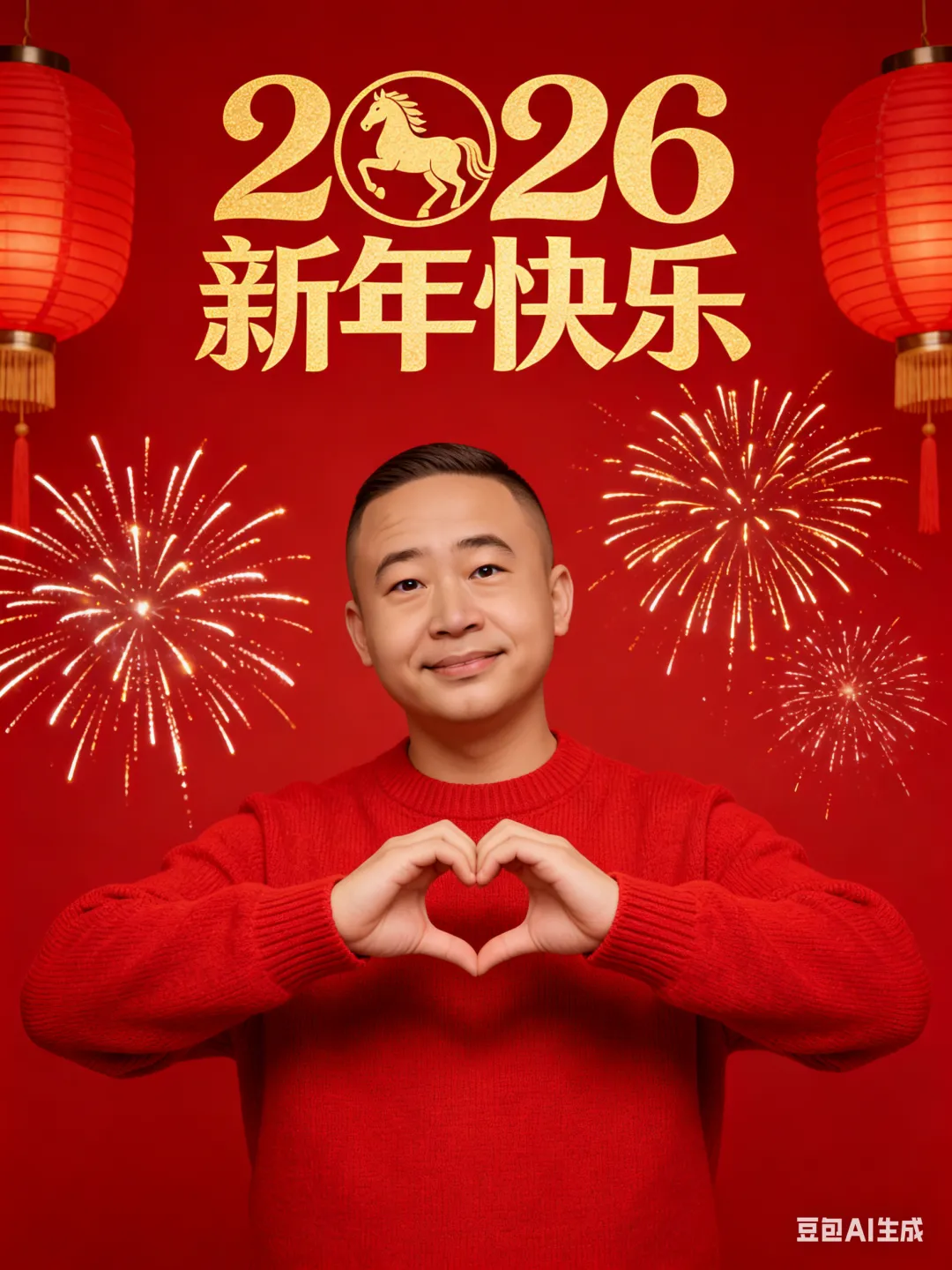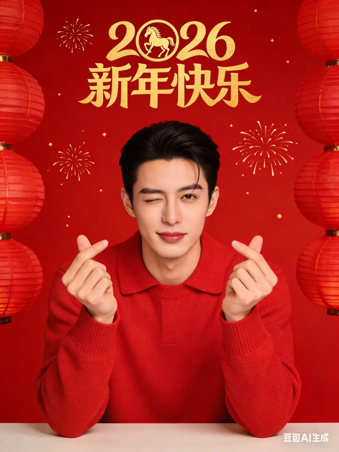 就会得到:人物设定:帅气的中国男生,皮肤清爽,上半身入镜,脸部、手部细节清晰 发型:利落短发,干净清爽,展现干练气质 服饰:身着红色时尚休闲毛衣,凸显新年氛围与时尚感 妆容:打造清爽素颜感,五官立体,唇形利落,凸显阳光帅气的自然状态,展现好气色 背景场景:背景为大红色,上方有金色的 “2026 新年快乐” 字样且带有马的图案,两侧布置红色灯笼,空中点缀烟花,营造浓厚新年氛围 动作姿态:男生面向观众,双手做出比 “爱心” 的清爽动作,动作灵动自然,表情丰富多样,每张图片都展现不同阳光神态,突出阳光帅气的气质 拍摄参数:采用真实摄影,中景拍摄,正向视角,高清画质,以展现人物整体与背景环境。通过专业打光,凸显人物面部与手部细节,营造电影质感 滤镜风格:整体画面增强喜庆氛围,色调以红色为主,金色点缀,提升色彩饱和度,增强画面明亮度,打造大师级作品质感,比例3:4