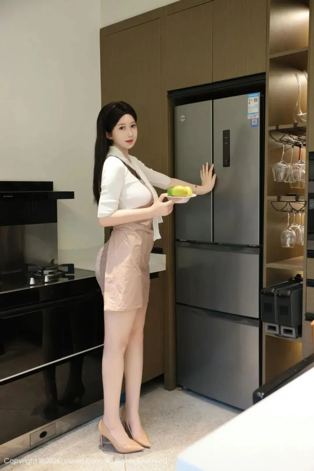 裙摆的长度停留在膝上,露出修长笔直的双腿,搭配同色系的丝袜与裸色尖头高跟鞋,视觉上延伸了腿部线条,让步履间自带一种从容的优雅。她的长发如瀑布般垂落,乌黑亮丽,与浅色调的穿搭形成鲜明对比,却又和谐相融。
