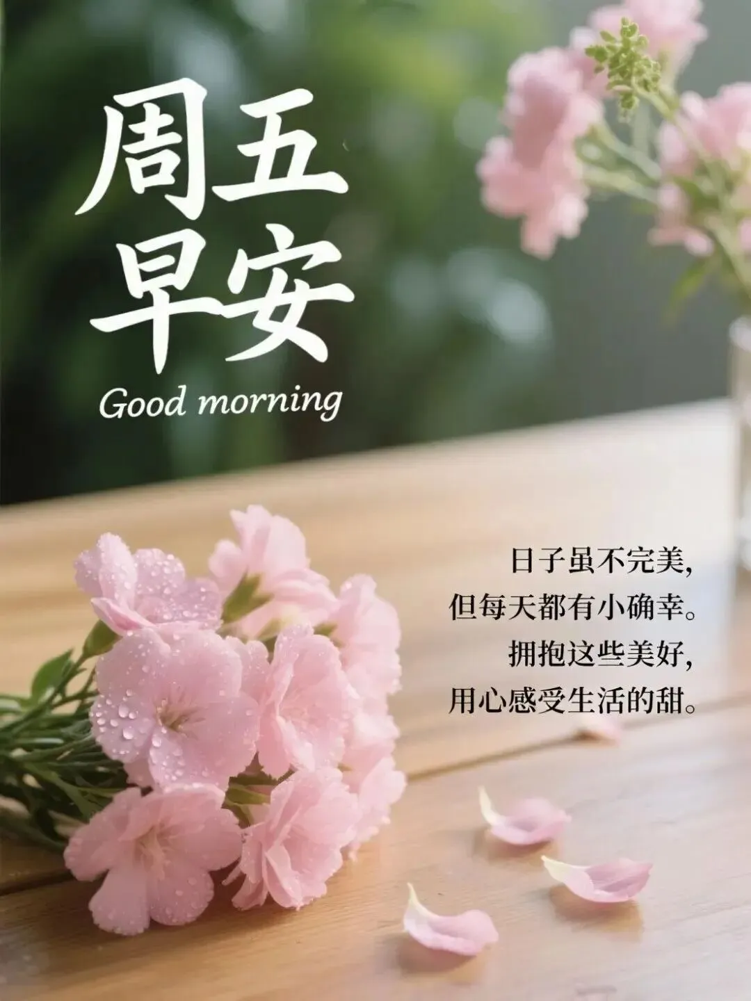 清晨醒来,遇见美好☀️,周五驾到,烦恼跑掉😜,让阳光填满心房🌞,让快乐点缀日常🎨,愿清风捎来安康🍃,暖阳带来吉祥🌻,事事顺顺利利✅,幸福岁岁年年,早安,周五快乐~