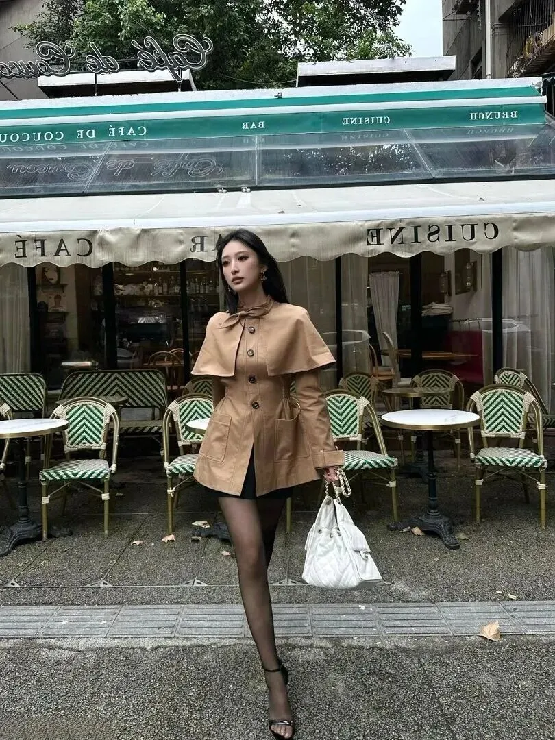 .这件斗篷风.衣简直就.是为.秋天量身.定做的。.整体看起.来像一.杯热拿铁.,温.暖又有.层次。风.衣长度.刚好到.大腿中.间,露.出一点黑.色A字短.裙。这种.上面宽松.下面.收紧的穿法.特别.显身材.。斗篷领.子设计.很妙,.走路时.会轻轻飘动.,自带一.种随性.的优雅。难.怪有.人说,秋天.第一.件风衣选.斗篷款.准没错.