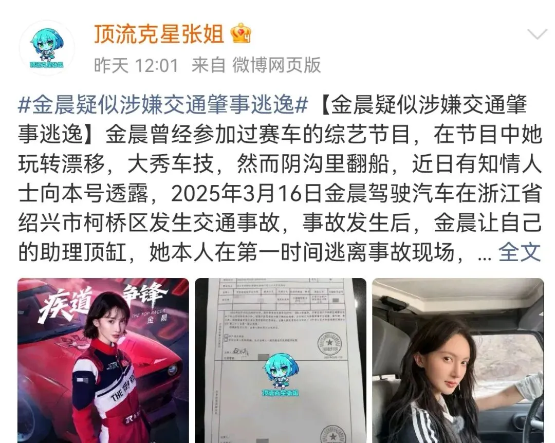 回想金晨在综艺《风驰赛车手》里,曾以此立过“女赛车手”的人设,自夸车感超棒,甚至被称为漂移女神。如今看来,这层滤镜碎得稀烂。如果你车技真的好,为什么会撞上民房围墙?如果你真的有担当,为什么在事故发生后的第一时间选择逃离,把烂