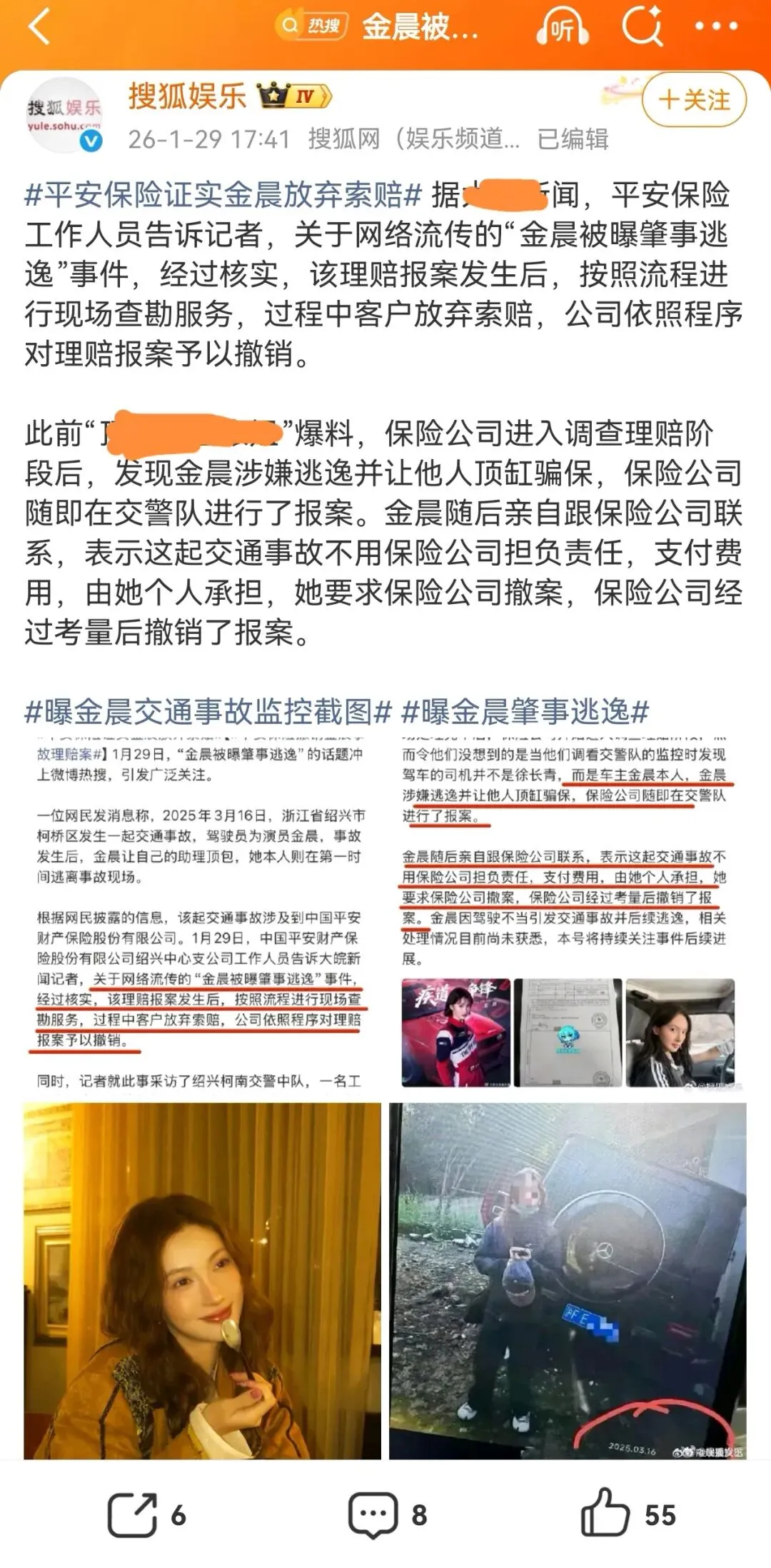 现在网上有一种很天真的论调,说金晨方面已经自掏腰包承担了损失,保险公司也撤案了,这事儿是不是就算翻篇了?