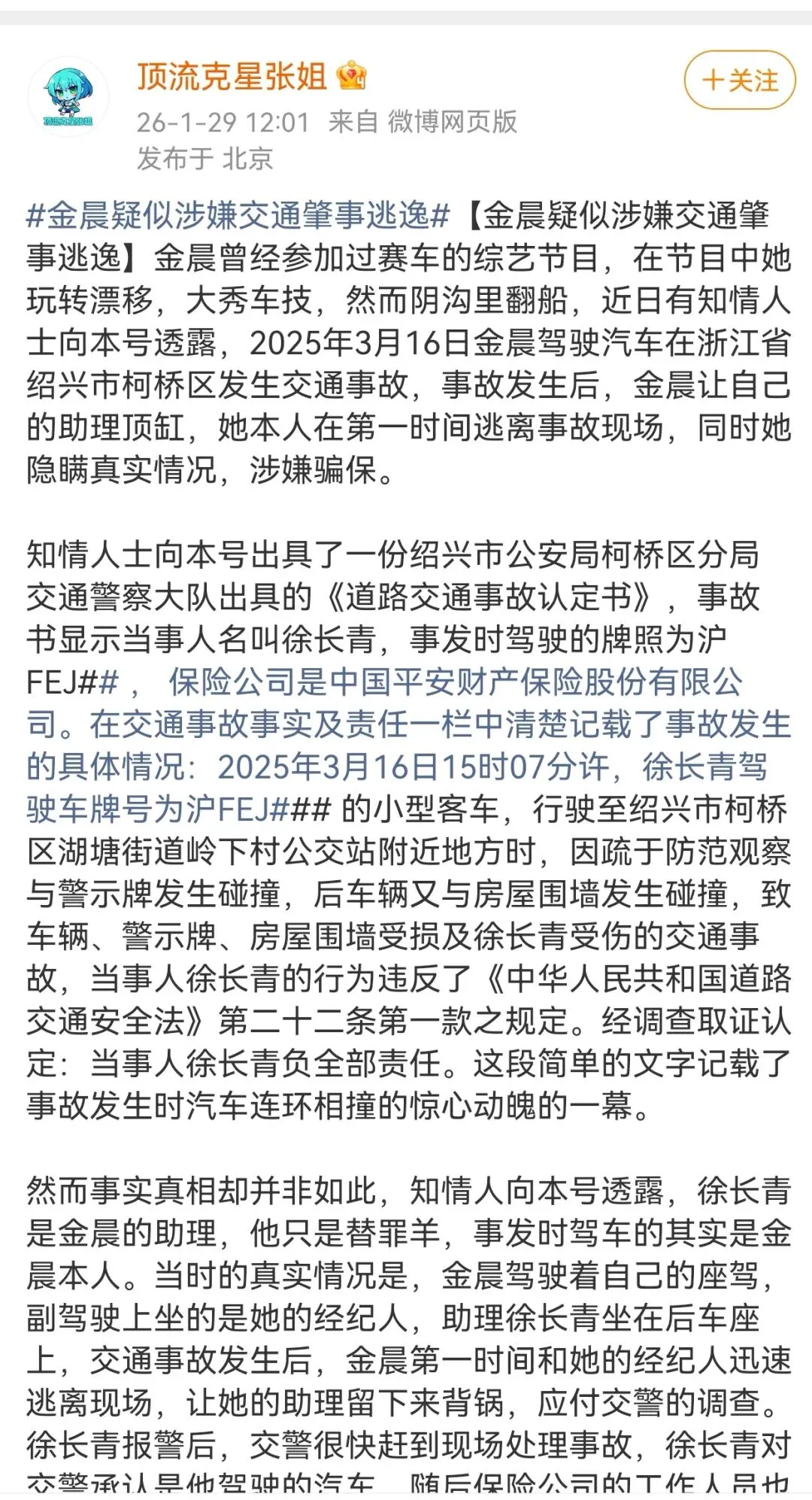 事情发生在2025年3月16日,地点是浙江绍兴。如果只看那张编号为330621420250009778的道路交通事故认定书,驾驶人赫然写着徐长青。这是一个在金晨团队里连名字都很少被提起的助理。白纸黑字,似乎这就是真相。