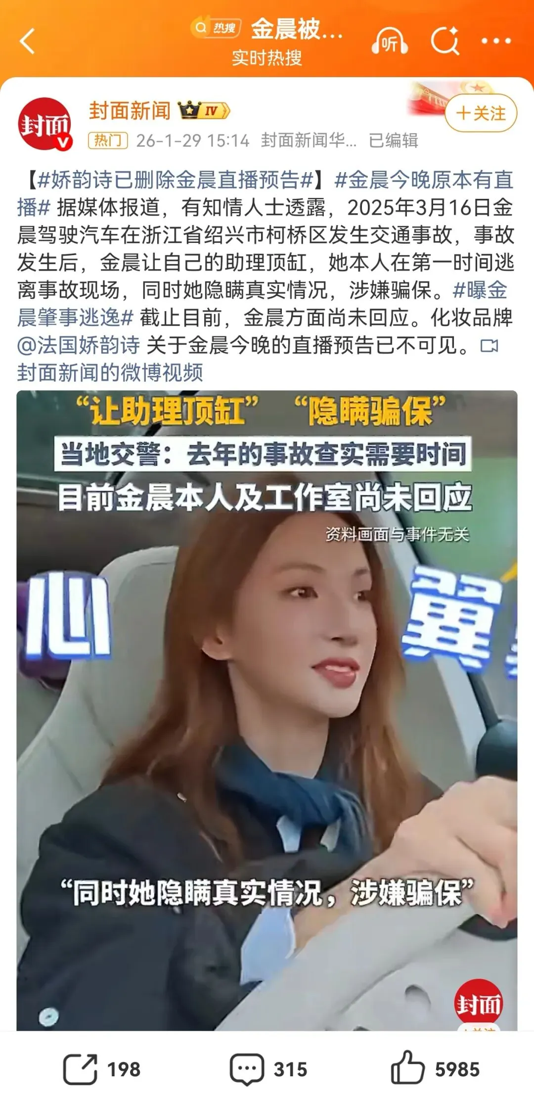 有网友评论得很扎心,明星犯错,打工人坐牢。娇韵诗已经删除了金晨的直播预告,资本的嗅觉是最灵敏的。当一个人设建立在虚假之上,崩塌只是时间问题。