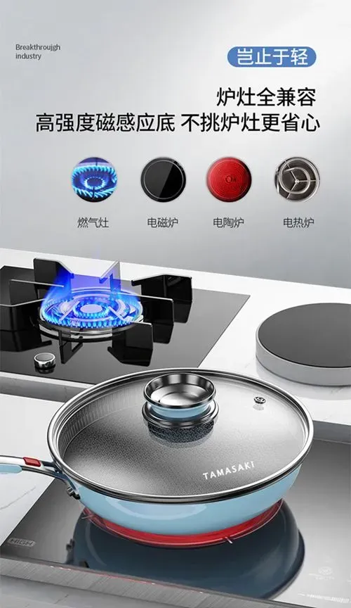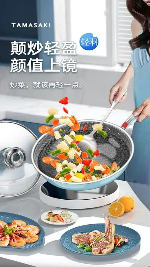 品牌】TAMASAKI产品】轻羽系列不粘平底炒锅直径】30CM、32CM、34CM主材】不锈钢产地】中国质保期】1年使用场景】燃气灶、电磁炉等)