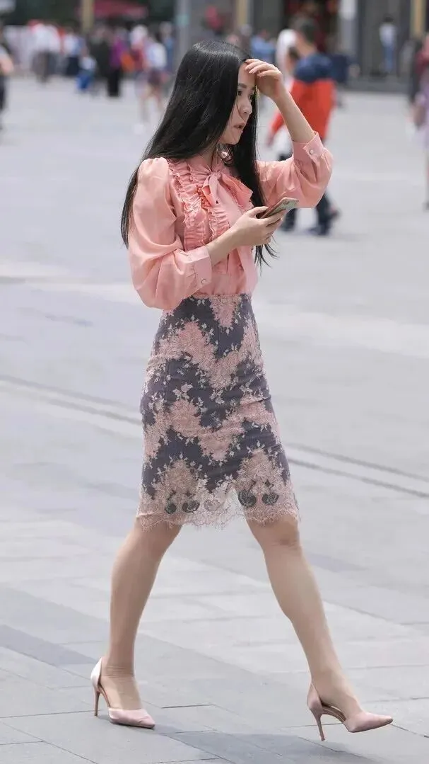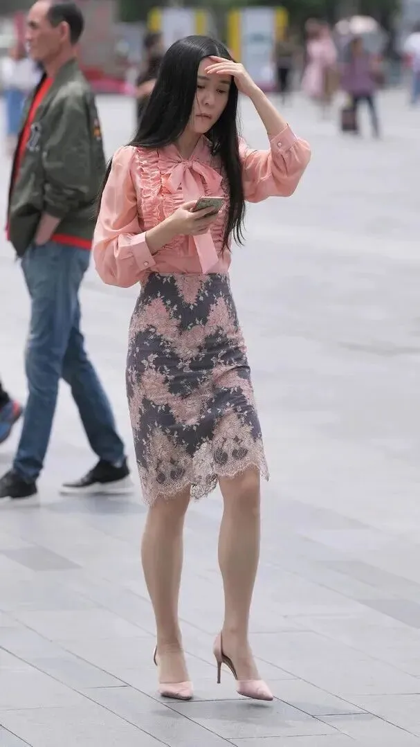 .子的.蕾丝边若.隐若现,.灰色的包臀.裙上面还有.粉色小花.纹。这.些小.花纹和衬.衫的.颜色.配得刚.刚好,一点.都不突兀.。高.跟鞋.也是.浅粉色.的,走.在路上.发出.轻轻的响声.。周围来来.往往的人都.成了.背景板,这.套穿搭.在人群.里特.别显.眼。