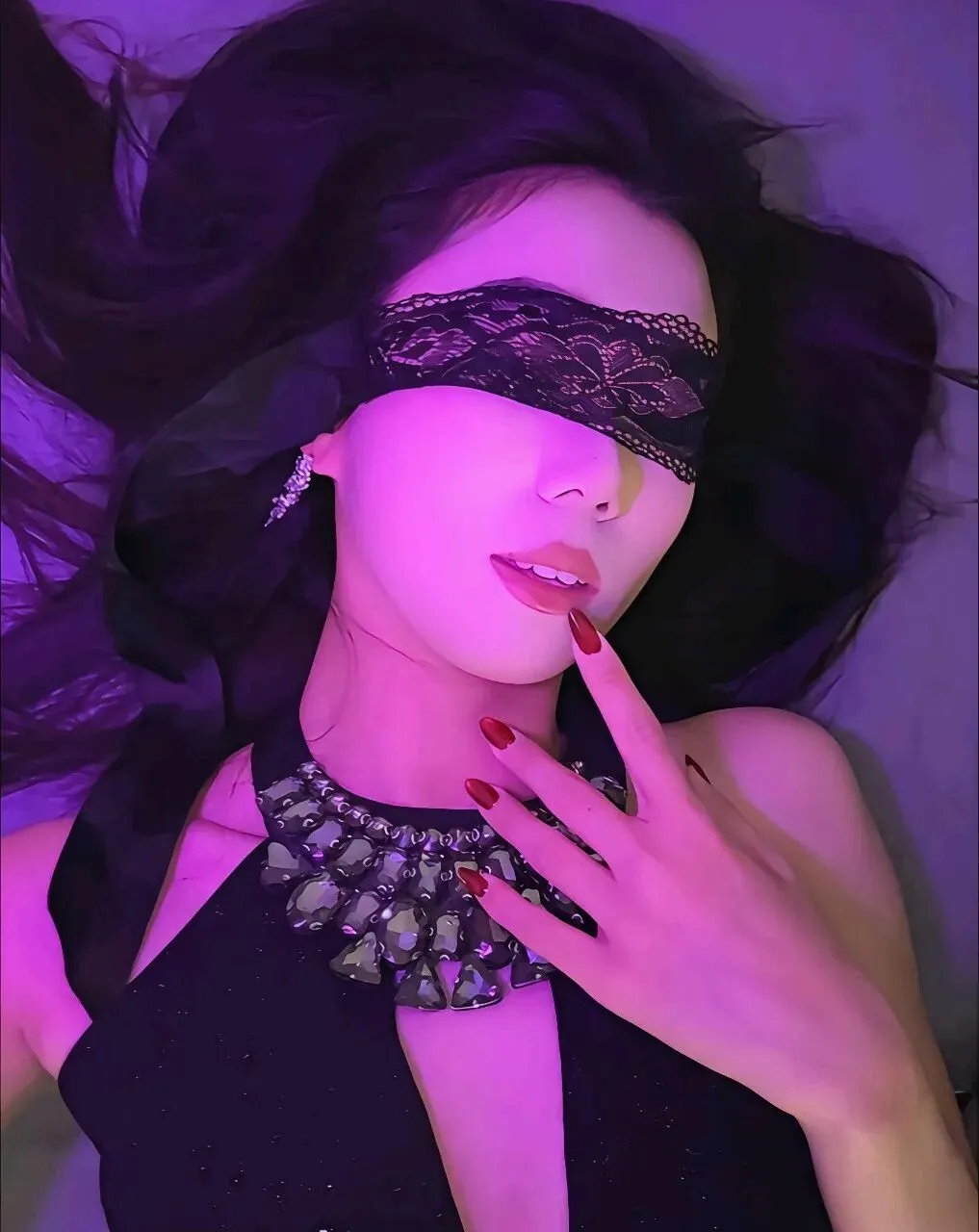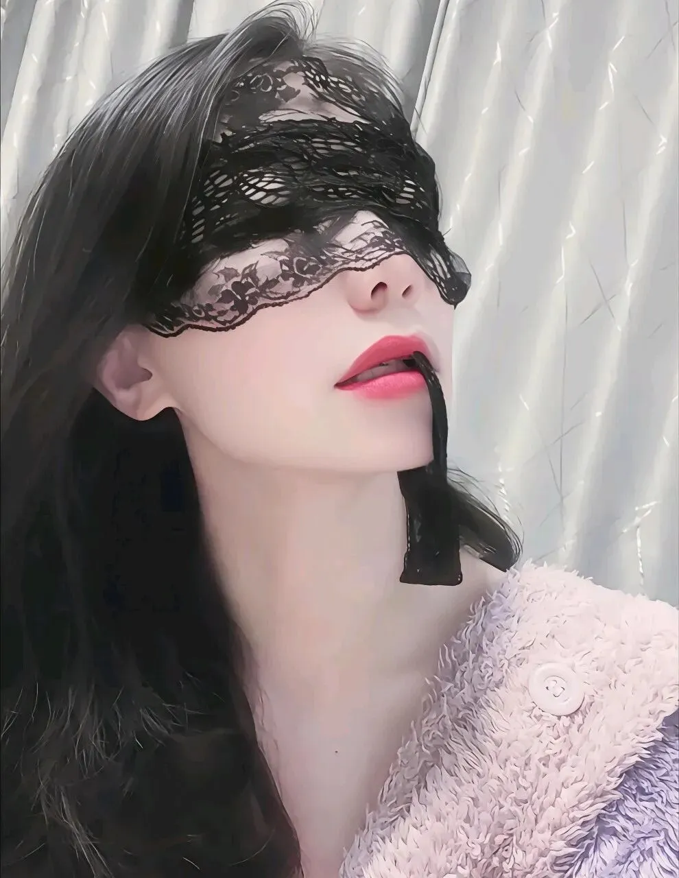 · 脆弱与力量的矛盾结合:眼部遮挡可能暗示“脆弱”(视觉受限),但蕾丝的装饰性又赋予其主动的审美选择,形成一种“易碎却自信”的矛盾气质,增加人格层次感。
