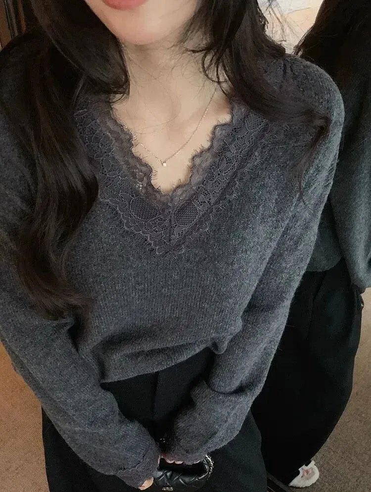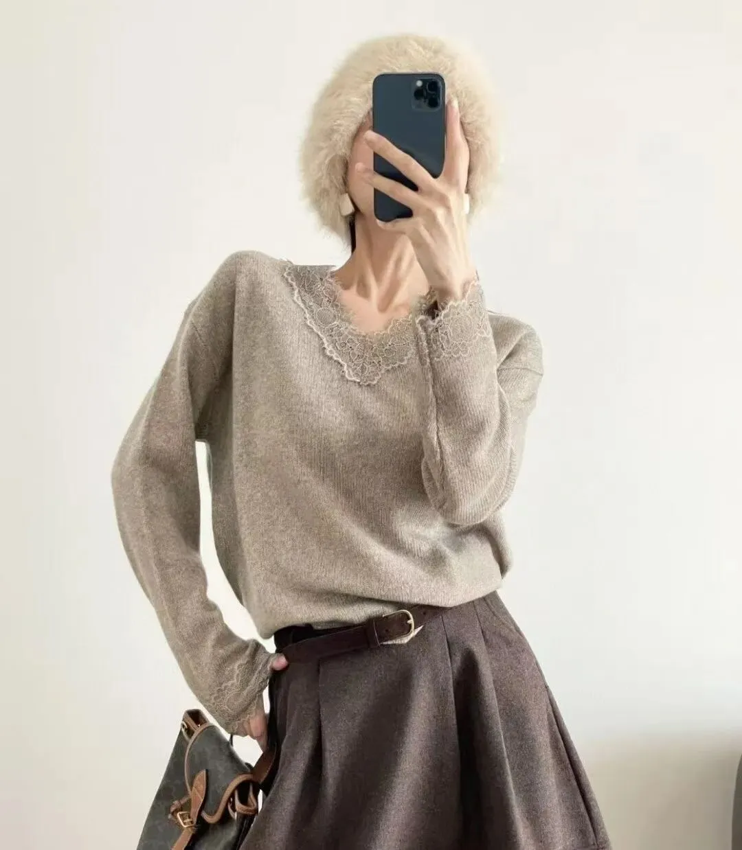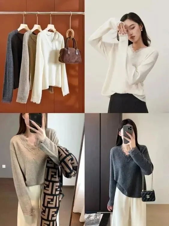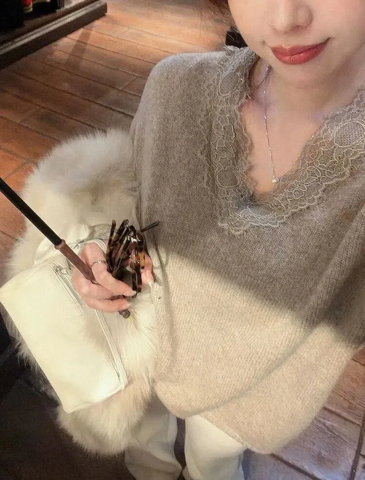 仙气迷人~新款高智感✨蕾丝拼接V领羊毛针织衫,专属于冬日的小精致,眼看上去美到挪不开眼