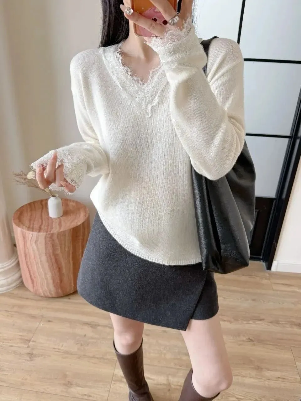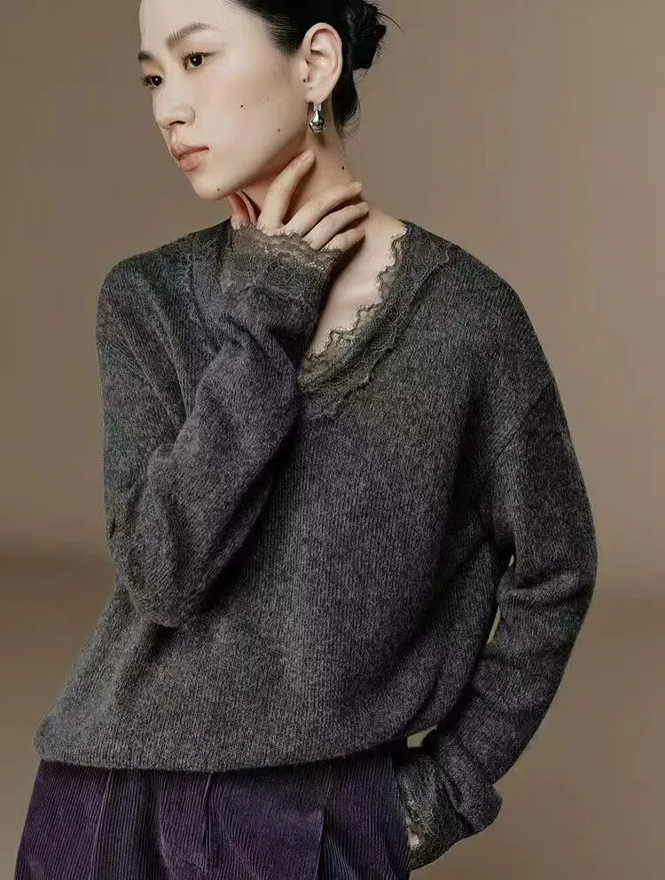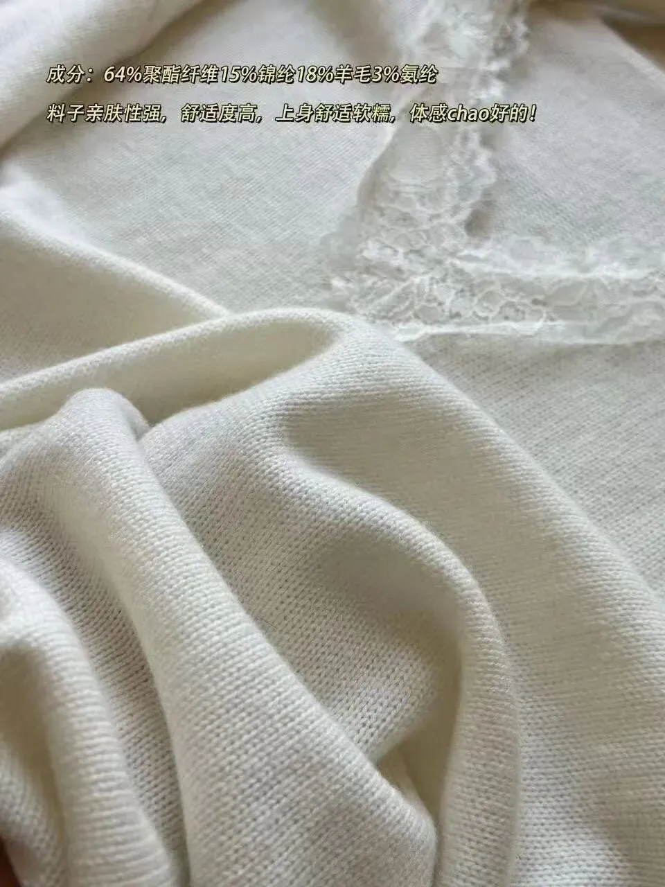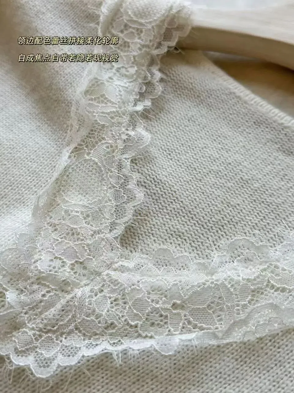 仙气迷人~新款高智感,蕾丝拼接V领羊毛针织衫